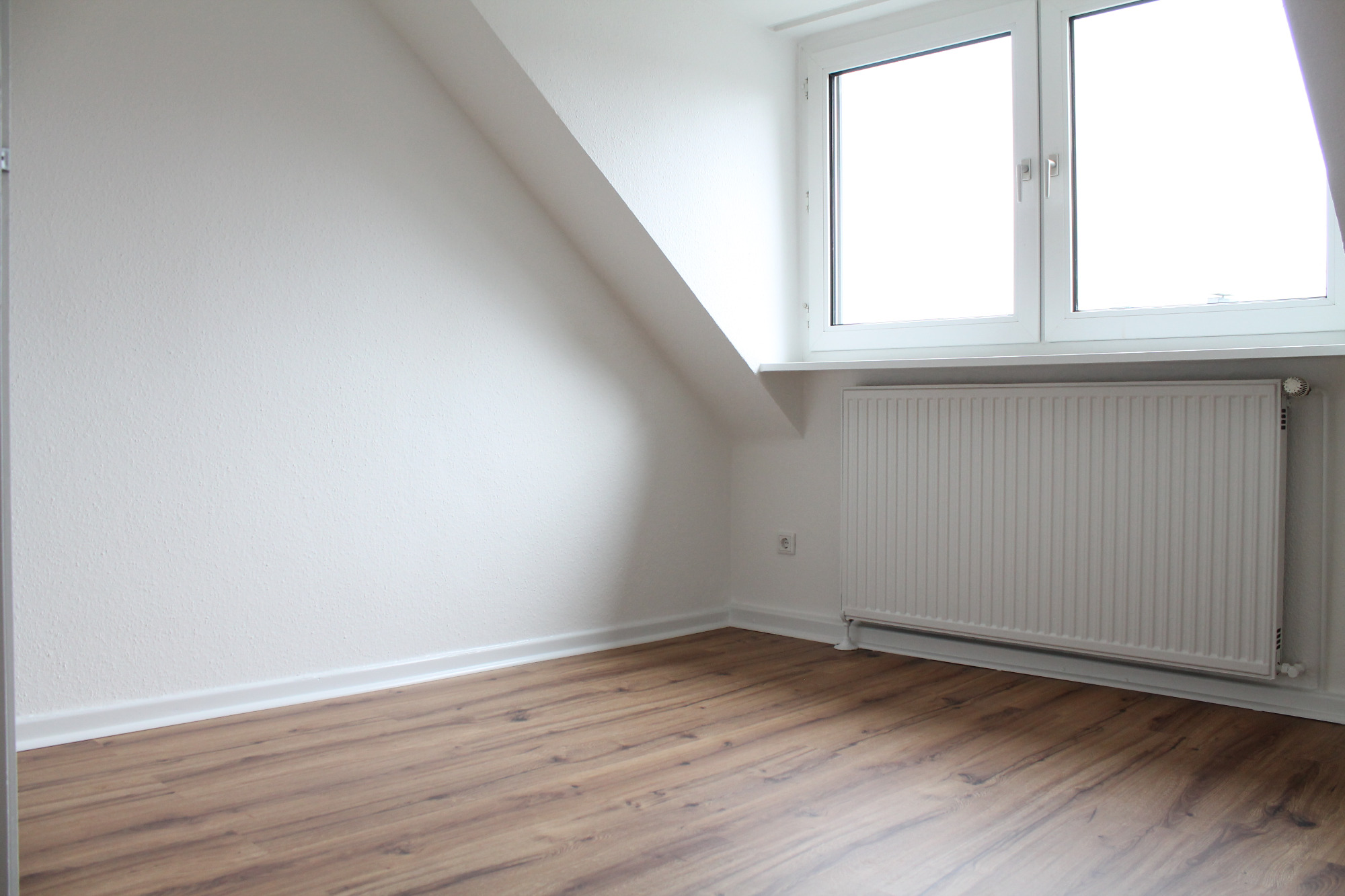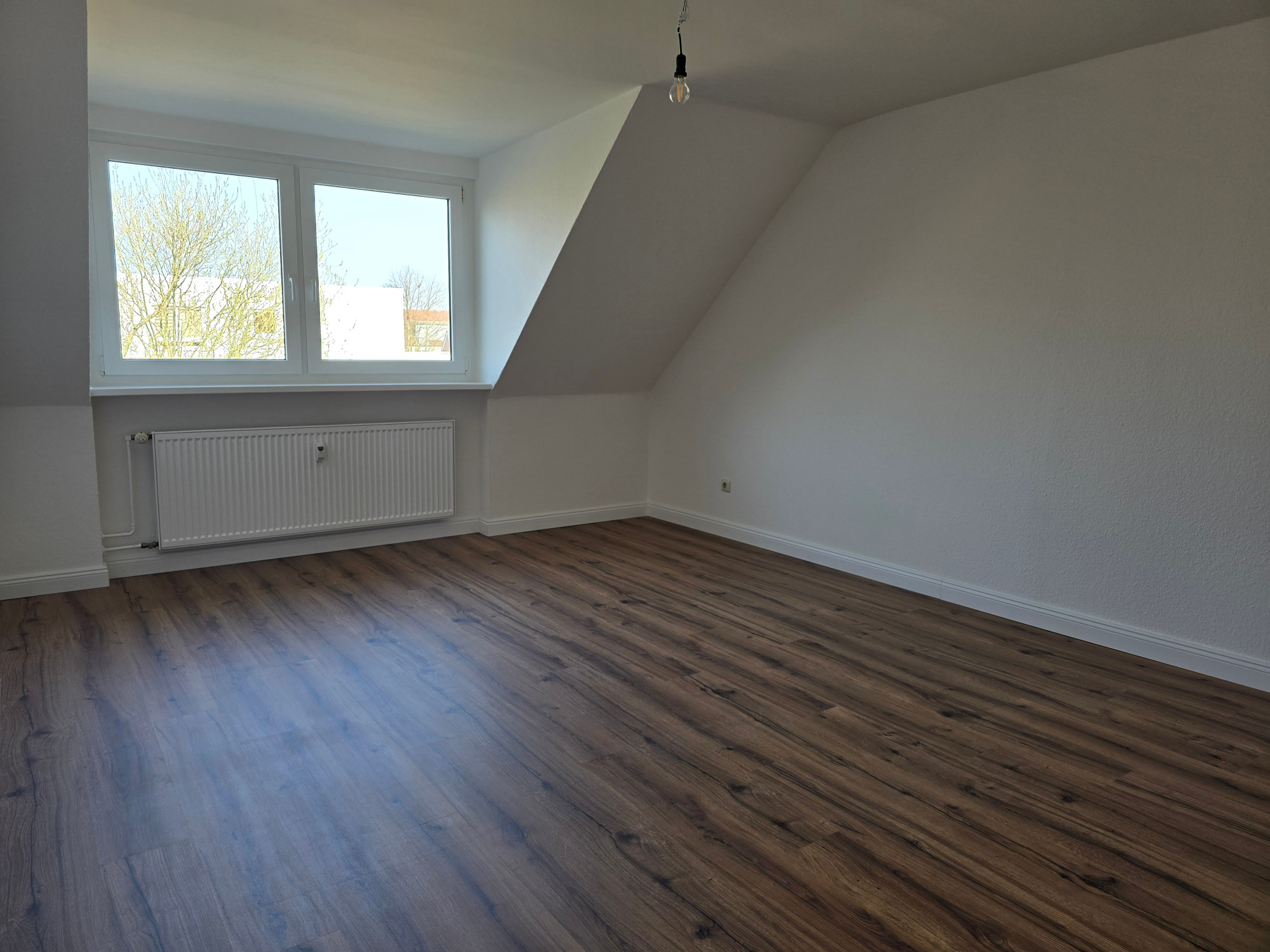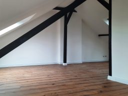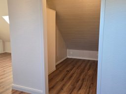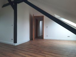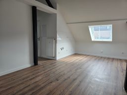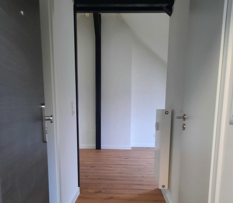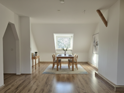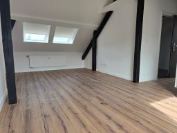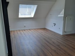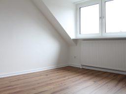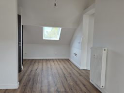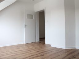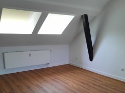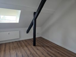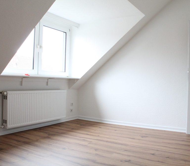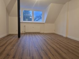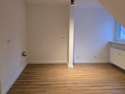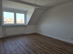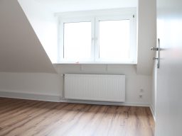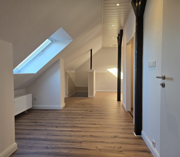 Die Wohnung bietet neben einem angenehmen Raumgefühl ebenso Moderne und Stil. Die Diele präsentiert sich hell und einladend. Sie dient nicht nur klassisch dem üblichen Betreten, sondern bietet auch noch Raum für Kommoden, einen Arbeitsplatz oder sonstigen Einrichtungsgegenständen. Sie führt direkt in den großen Wohnraum mit dezenten Schrägen. Hier sind gemütliche Stunden garantiert. Ebenso die Küche lädt auf Grund der Größe nicht nur zum Kochen ein. Neben einer Küchenzeile passt hier auch ein kleiner Esstisch. Das Schlafzimmer bietet Raum für Bett und Kommoden und ggf. einen kleineren Kleiderschrank. Ein kleines Highlight ist sicherlich das modernisierte Badezimmer mit Fenster, Dusche, Hänge-WC und Handtuchheizkörper.