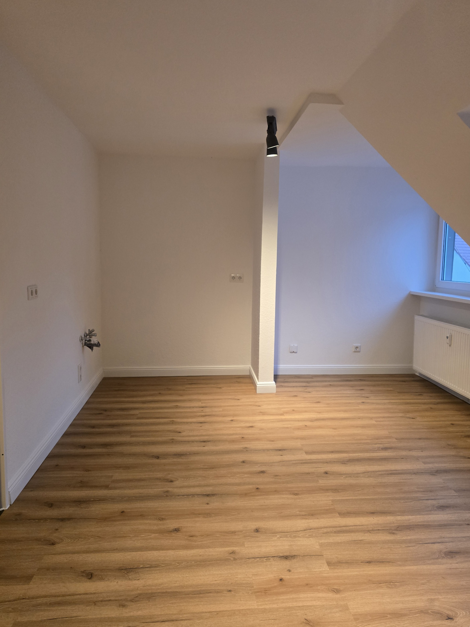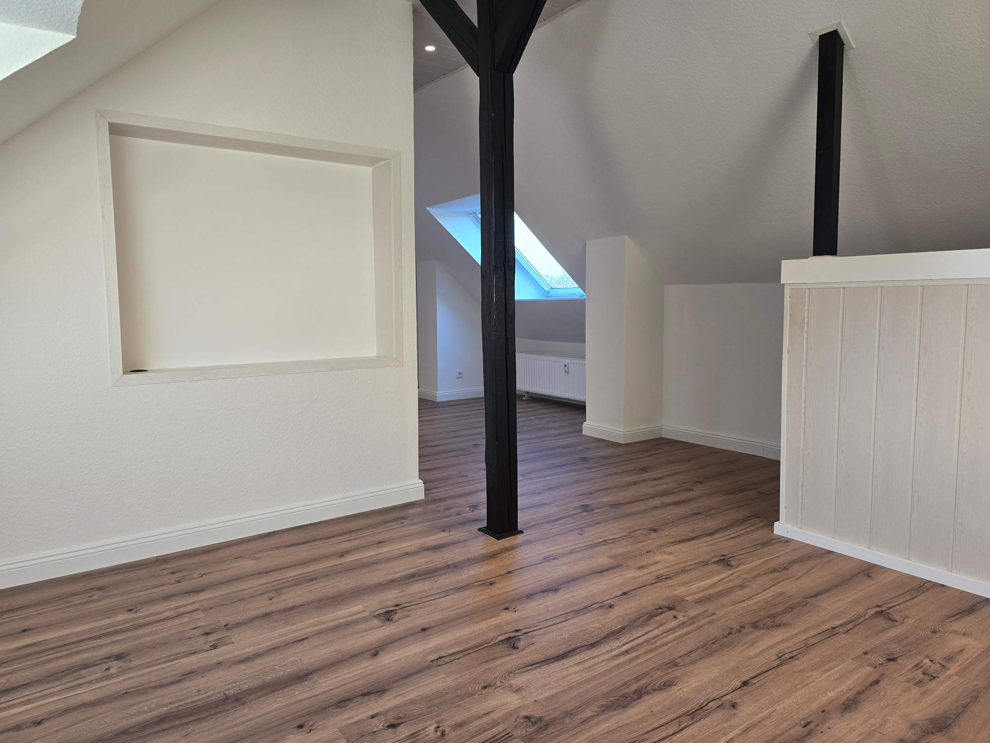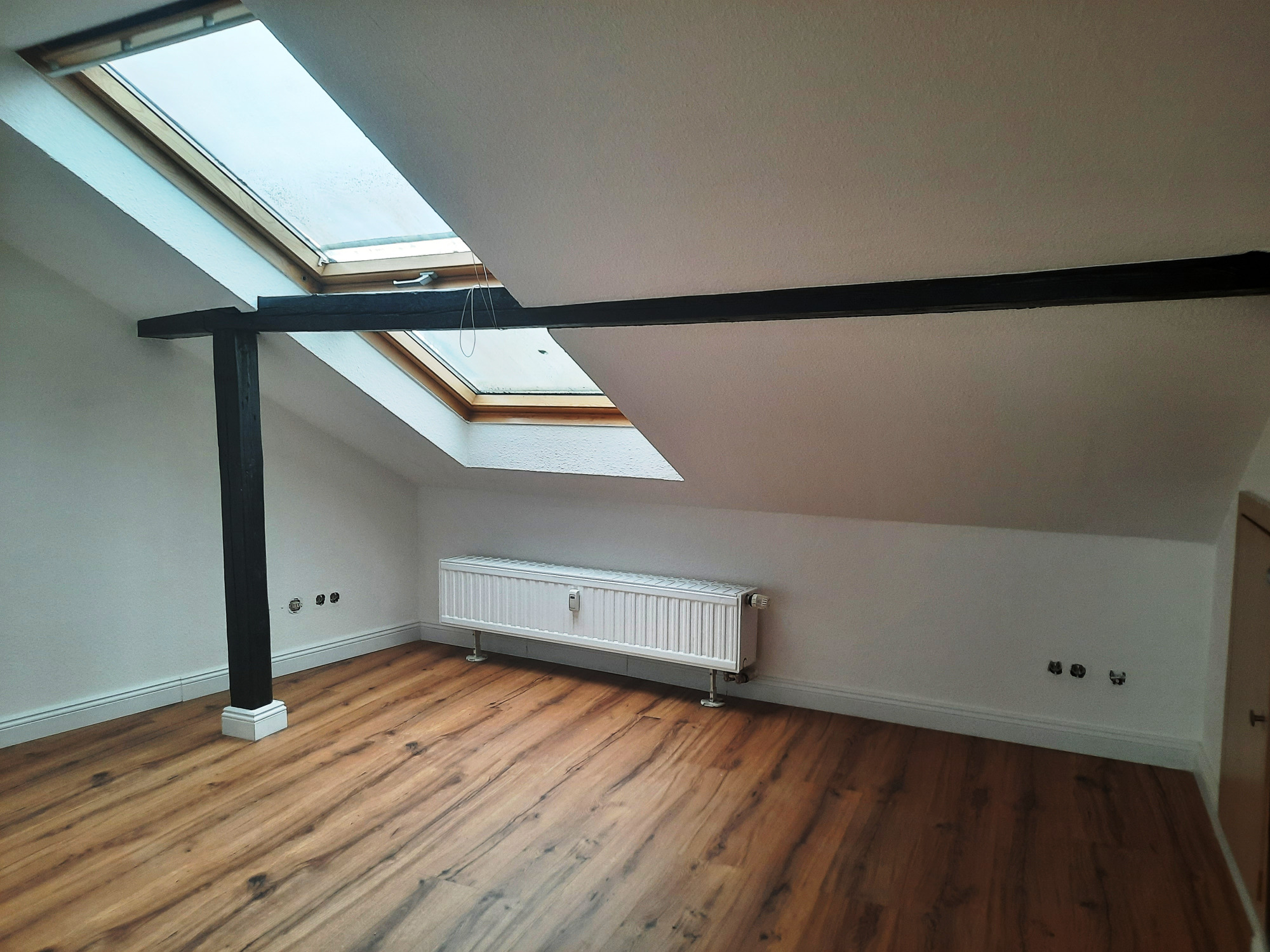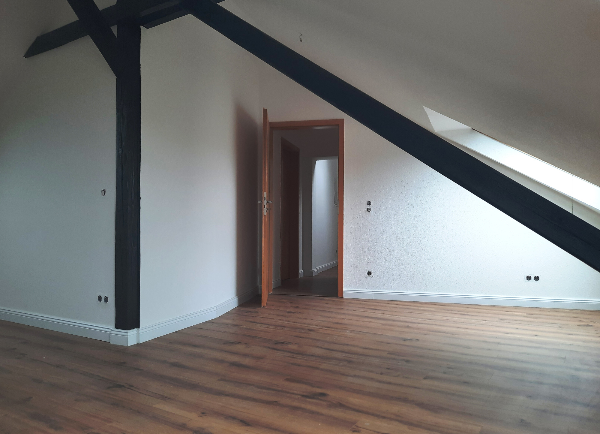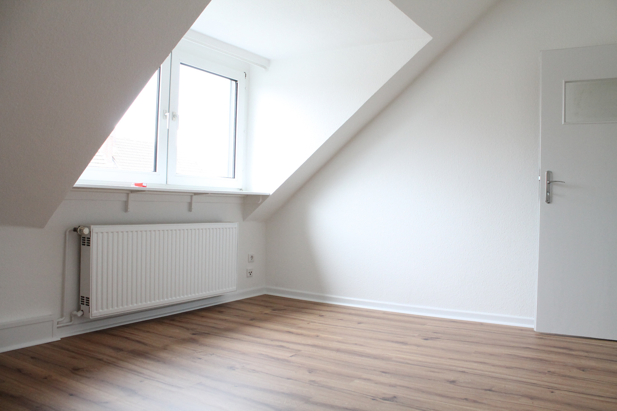 Die Wohnung bietet neben einem angenehmen Raumgefühl ebenso Moderne und Stil. Die Diele präsentiert sich hell und einladend. Sie dient nicht nur klassisch dem üblichen Betreten, sondern bietet auch noch Raum für Kommoden, einen Arbeitsplatz oder sonstigen Einrichtungsgegenständen. Sie führt direkt in den großen Wohnraum mit dezenten Schrägen. Hier sind gemütliche Stunden garantiert. Ebenso die Küche lädt auf Grund der Größe nicht nur zum Kochen ein. Neben einer Küchenzeile passt hier auch ein kleiner Esstisch. Das Schlafzimmer bietet Raum für Bett und Kommoden und ggf. einen kleineren Kleiderschrank. Ein kleines Highlight ist sicherlich das modernisierte Badezimmer mit Fenster, Dusche, Hänge-WC und Handtuchheizkörper.