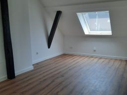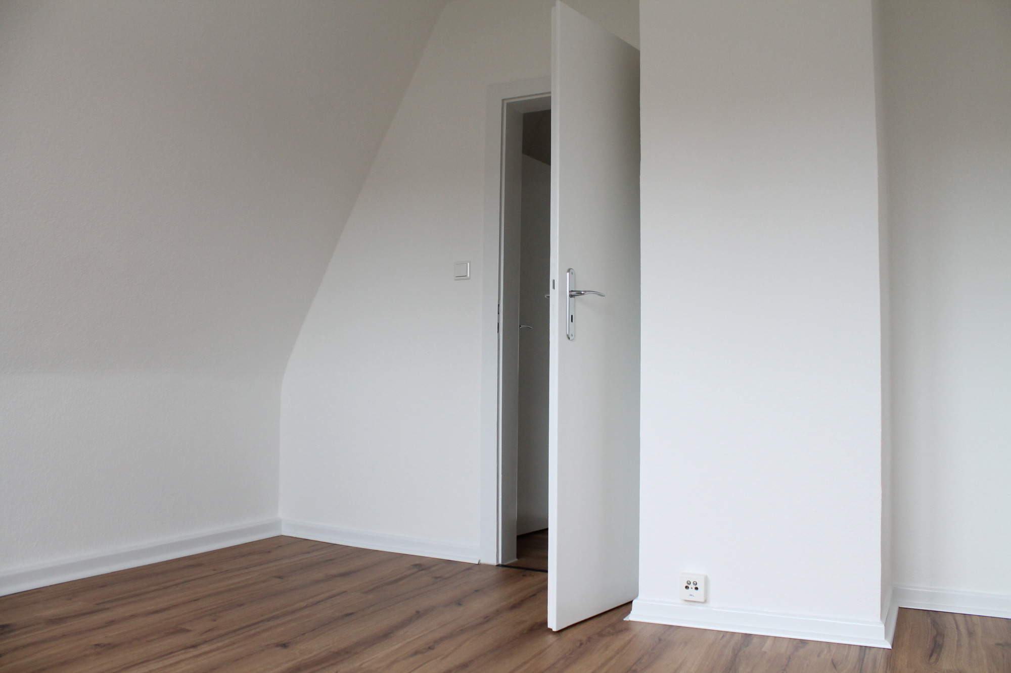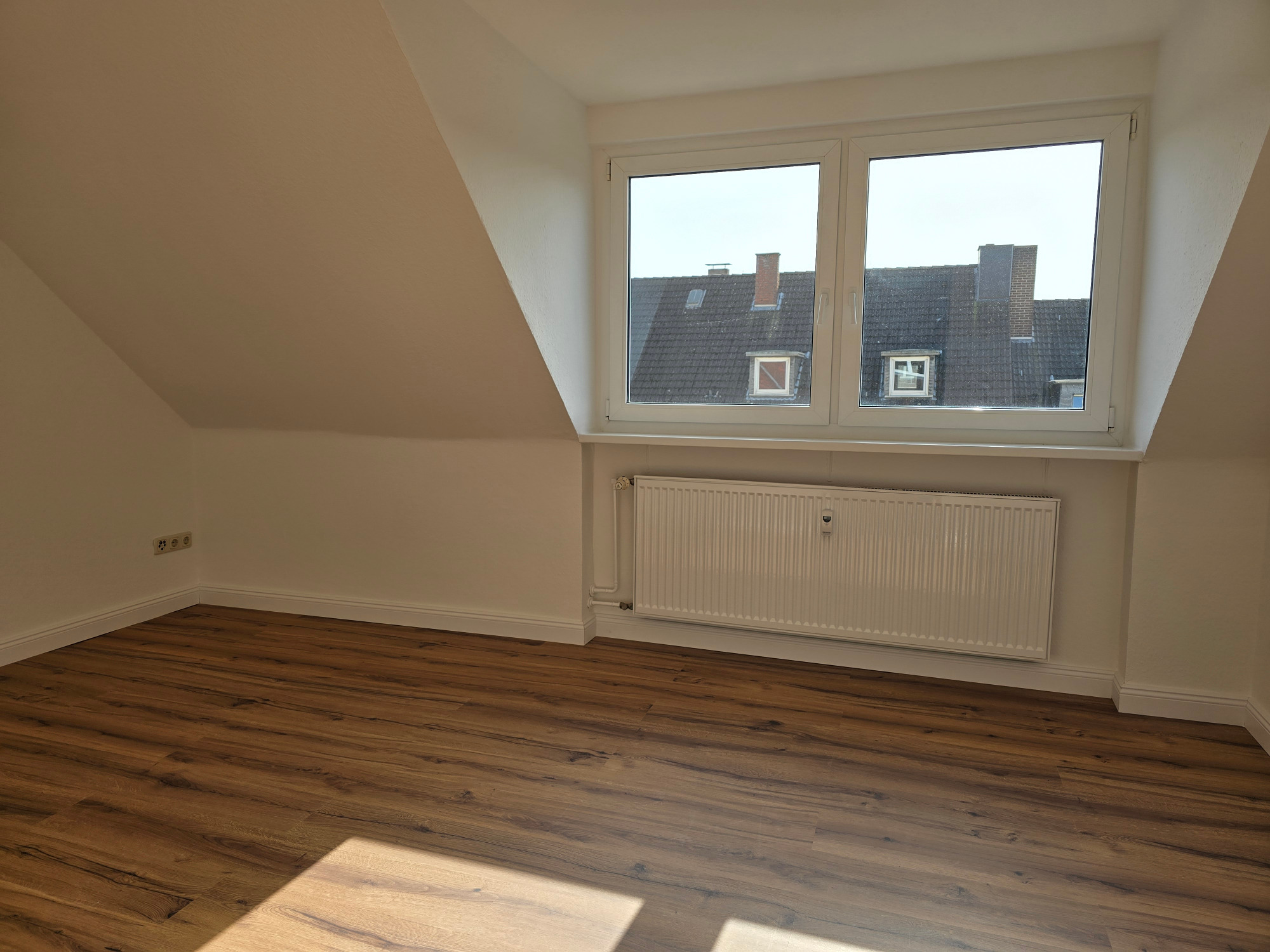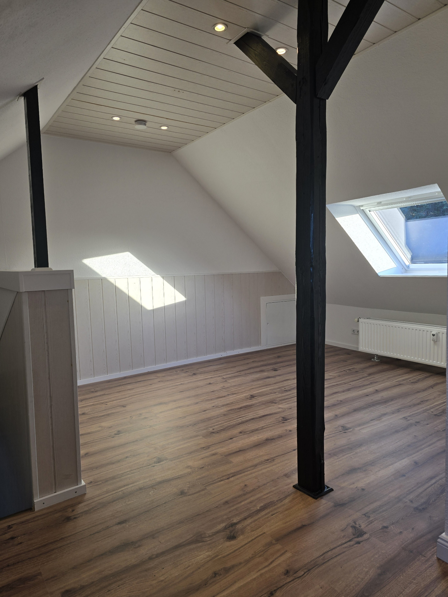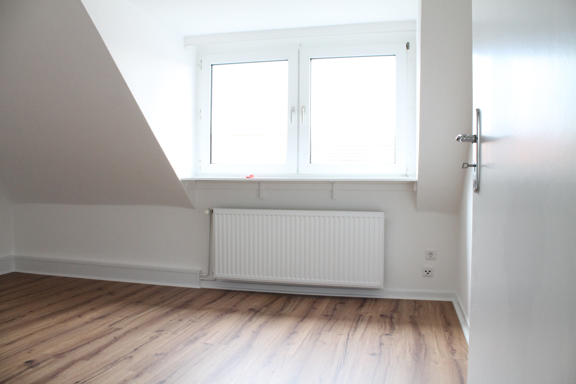 Die Wohnung bietet neben einem angenehmen Raumgefühl ebenso Moderne und Stil. Die Diele präsentiert sich hell und einladend. Sie dient nicht nur klassisch dem üblichen Betreten, sondern bietet auch noch Raum für Kommoden, einen Arbeitsplatz oder sonstigen Einrichtungsgegenständen. Sie führt direkt in den großen Wohnraum mit dezenten Schrägen. Hier sind gemütliche Stunden garantiert. Ebenso die Küche lädt auf Grund der Größe nicht nur zum Kochen ein. Neben einer Küchenzeile passt hier auch ein kleiner Esstisch. Das Schlafzimmer bietet Raum für Bett und Kommoden und ggf. einen kleineren Kleiderschrank. Ein kleines Highlight ist sicherlich das modernisierte Badezimmer mit Fenster, Dusche, Hänge-WC und Handtuchheizkörper.