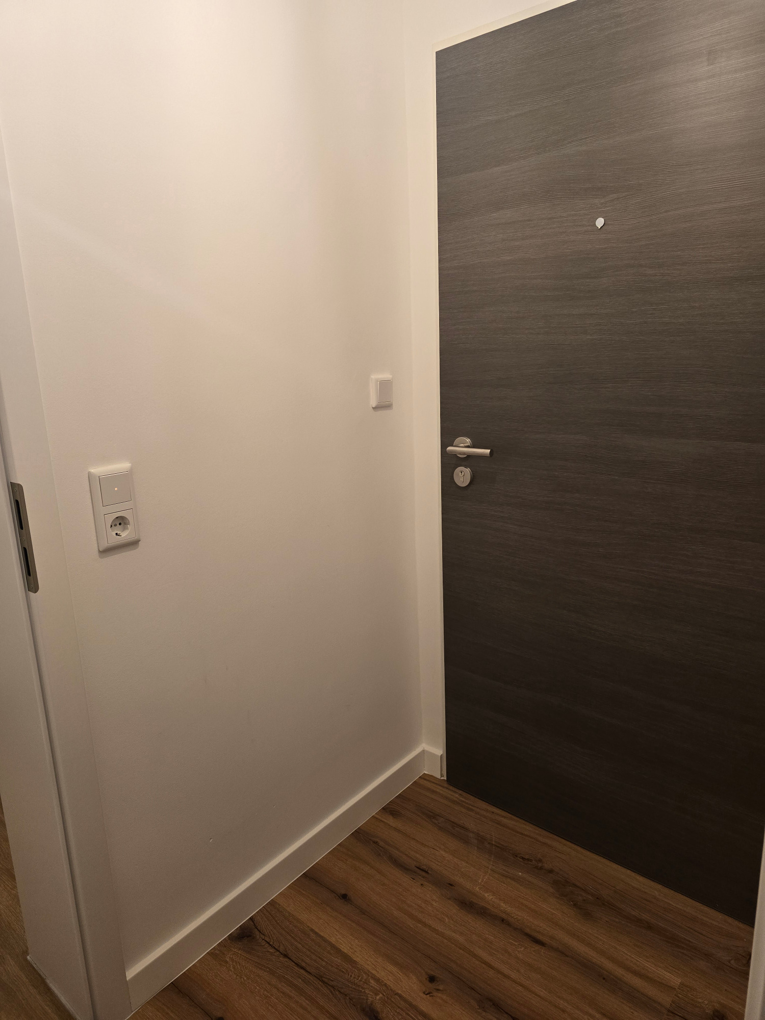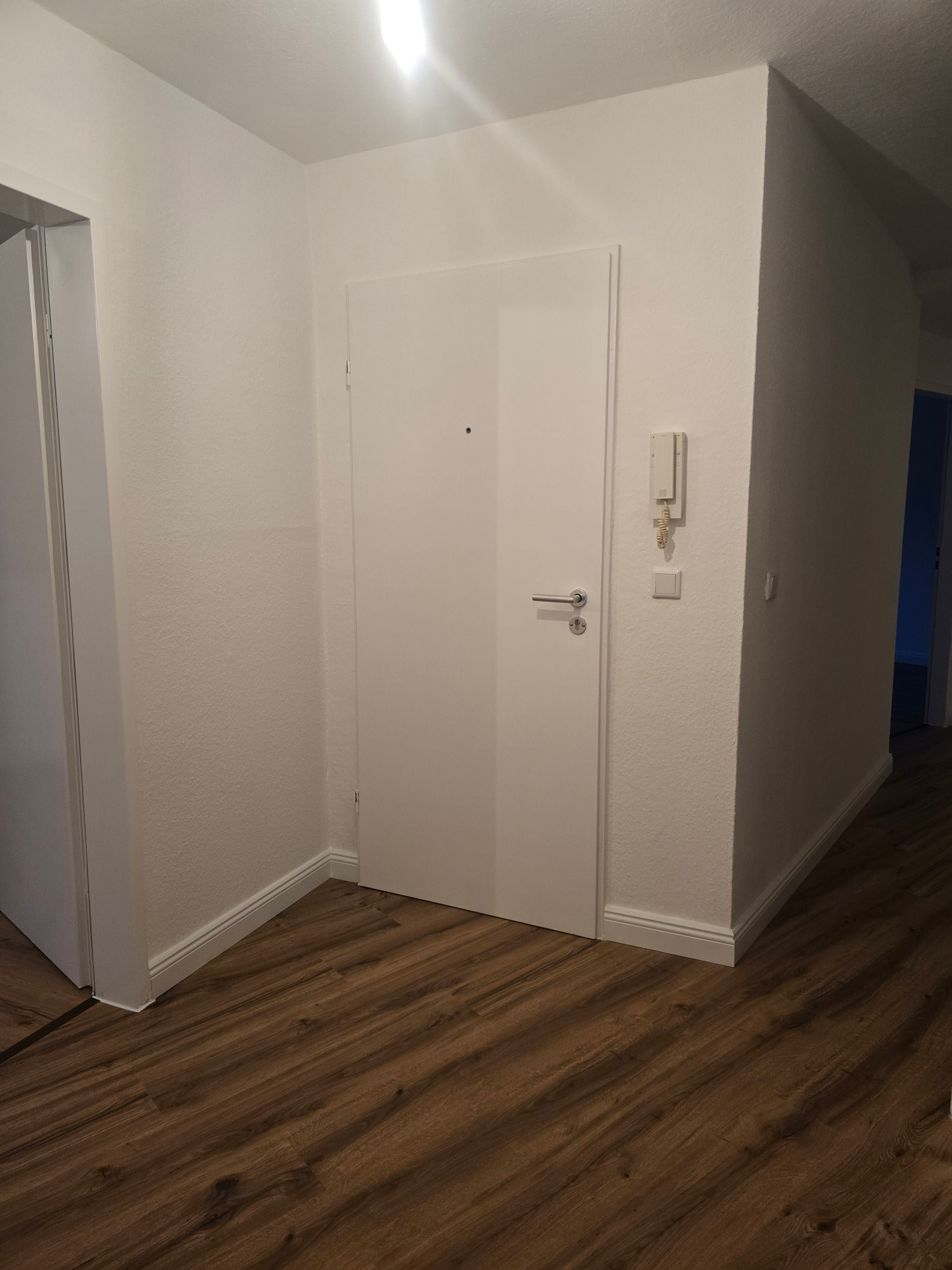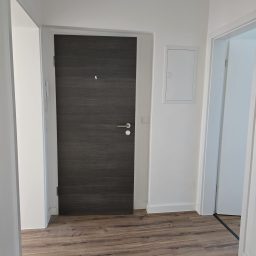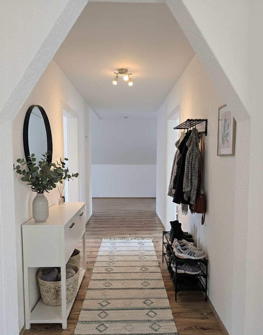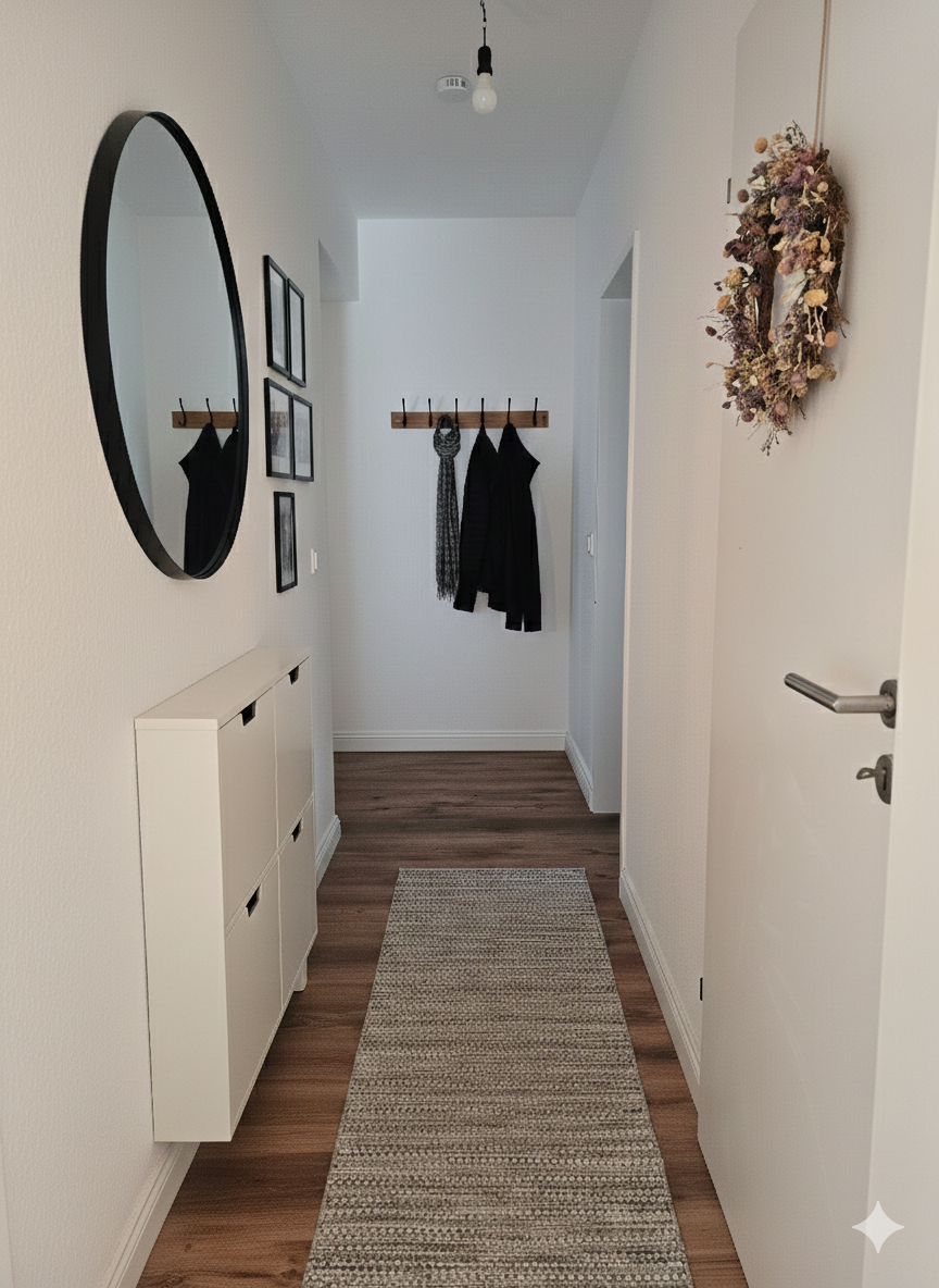 Beim Betreten der Wohnung gelangen Sie in eine freundliche Diele, die durch ihre dekorativen Gestaltungsmöglichkeiten Raum für individuelle Akzente bietet. Die moderne Sicherheitseingangstür sorgt dabei für ein gutes Gefühl von Komfort und Sicherheit.