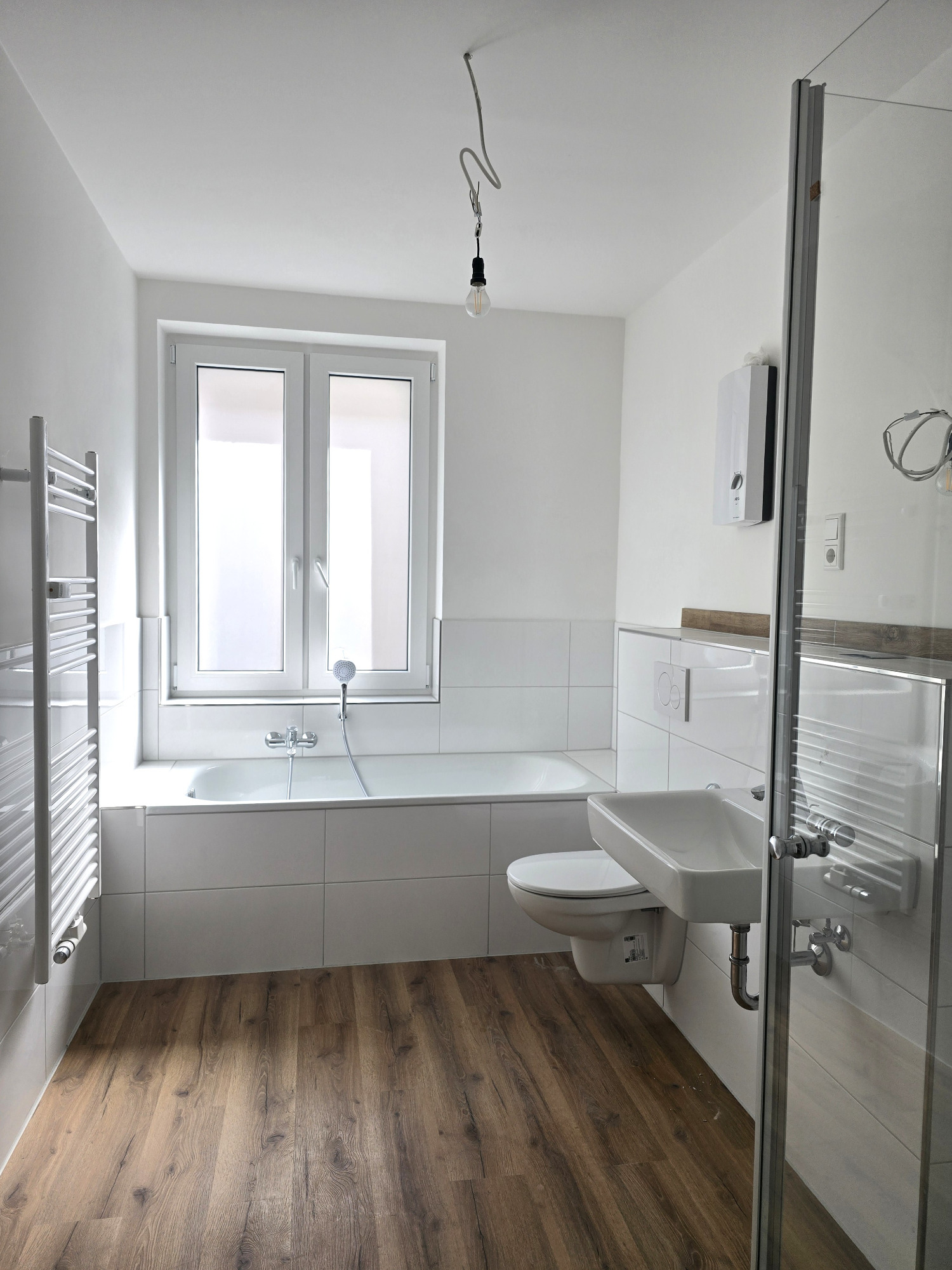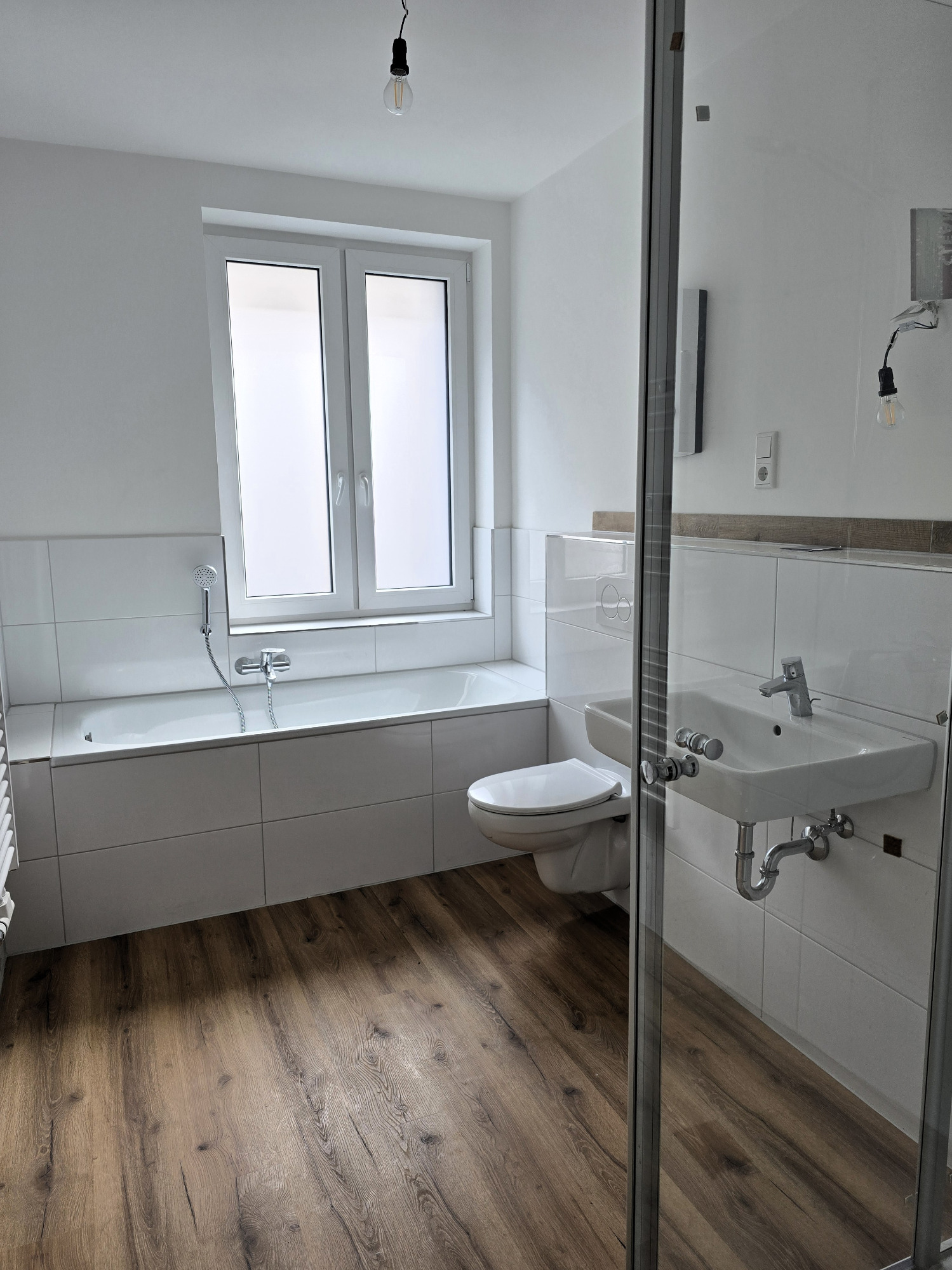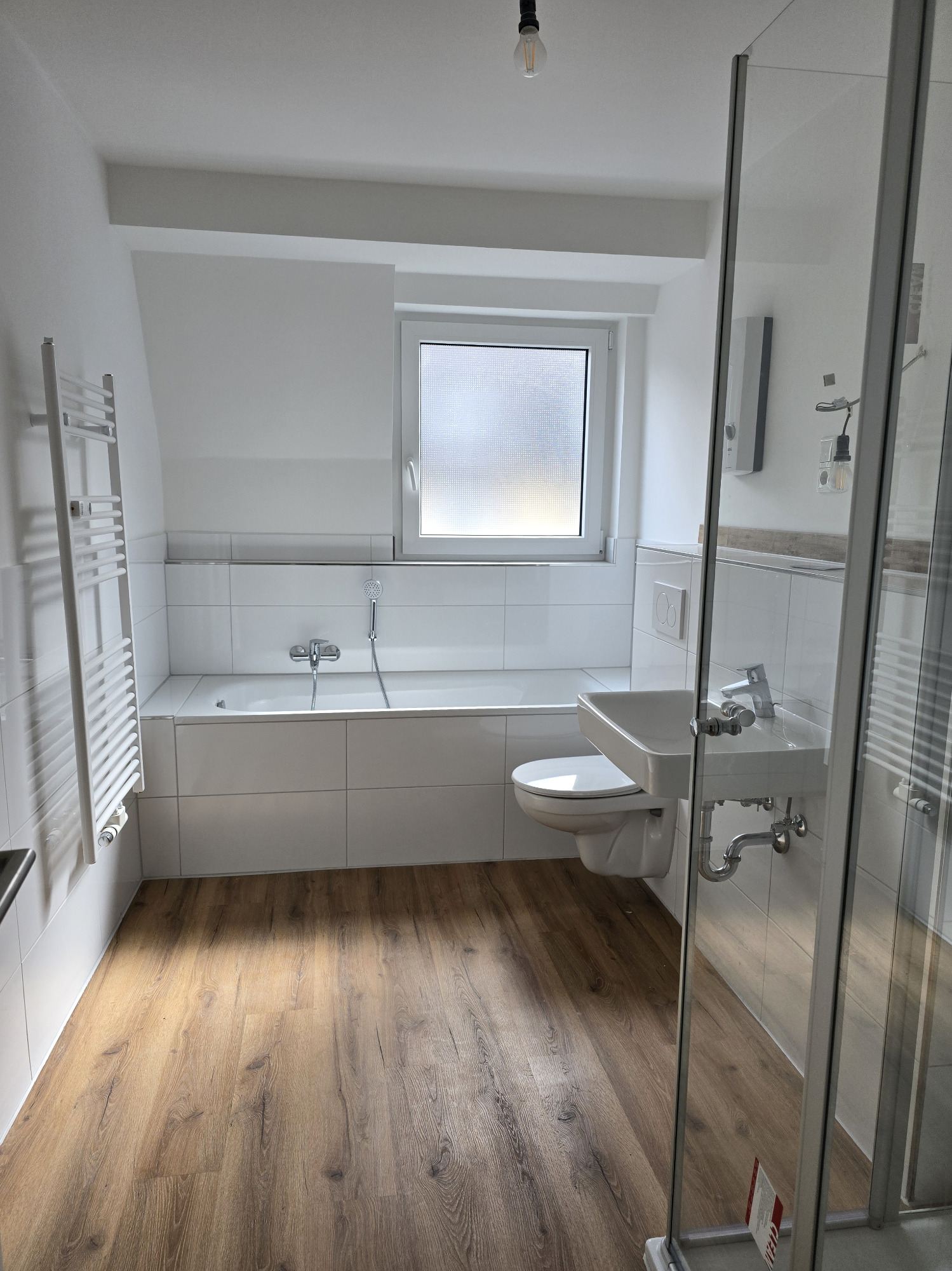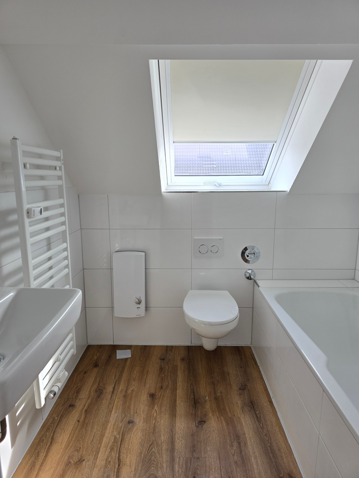 Das Badezimmer präsentiert sich nagelneu und geschmackvoll gestaltet – ausgestattet mit einer Badewanne, einem Hänge-WC und einem modernen Handtuchheizkörper. Hier trifft Funktionalität auf stilvolles Design.