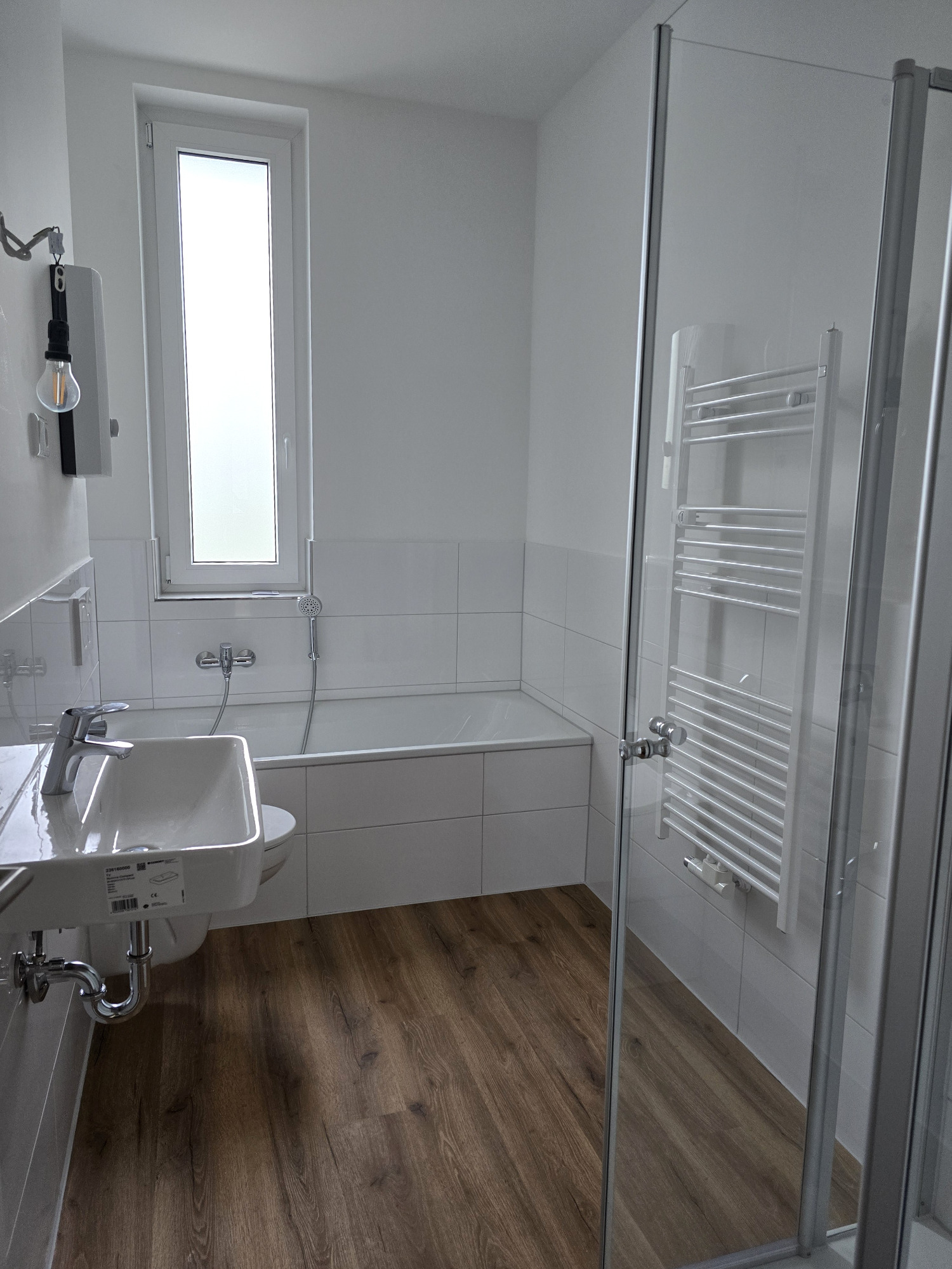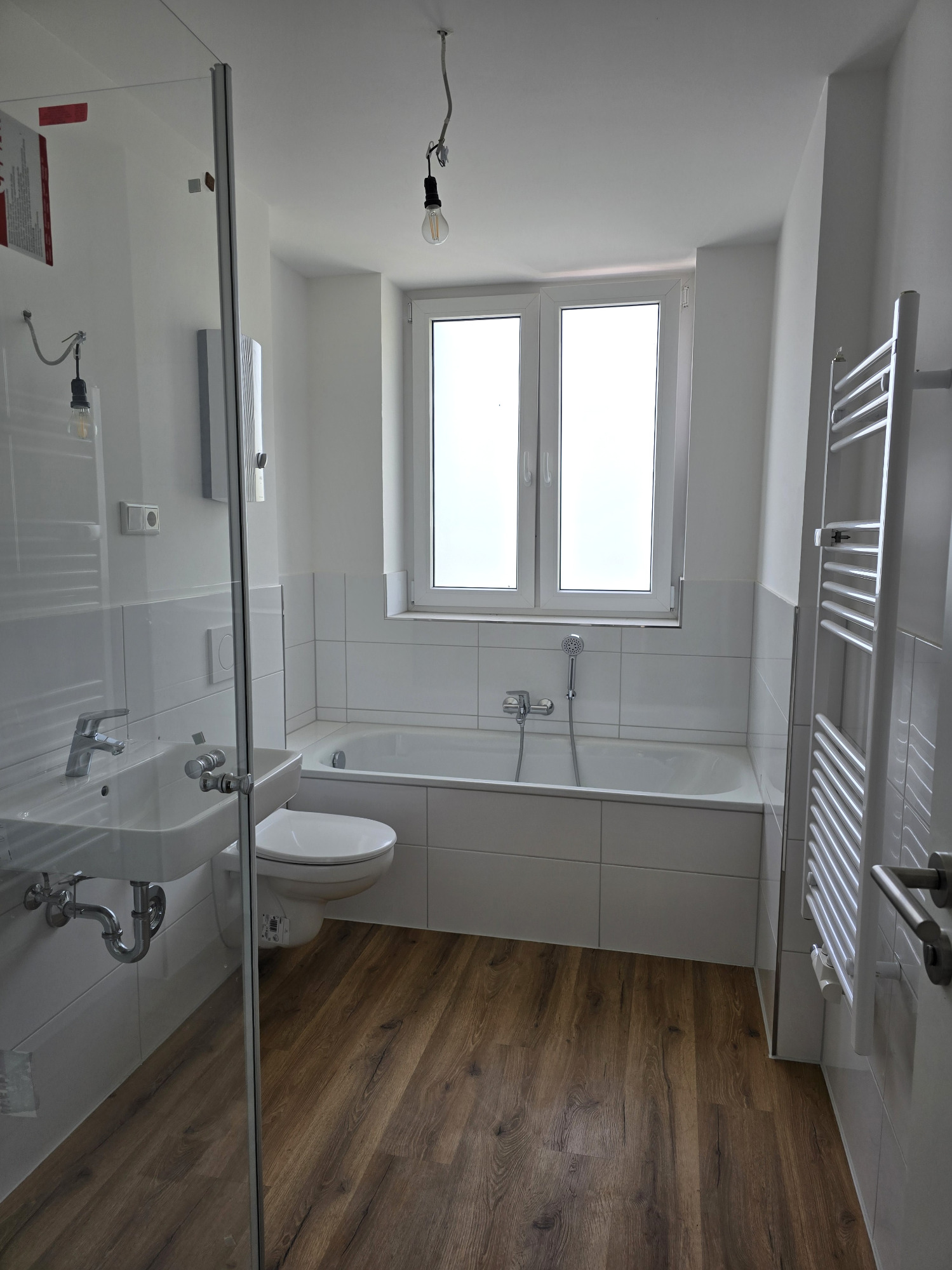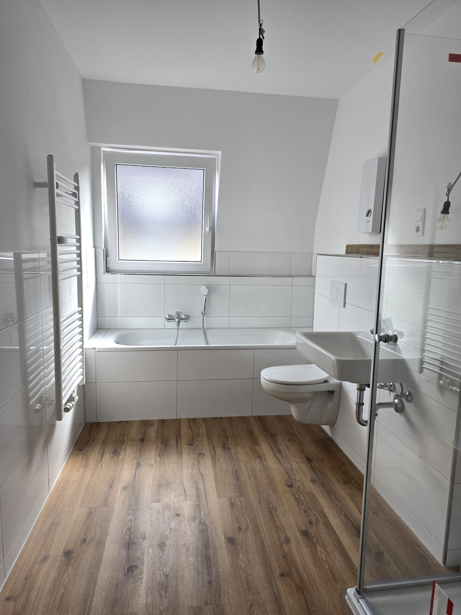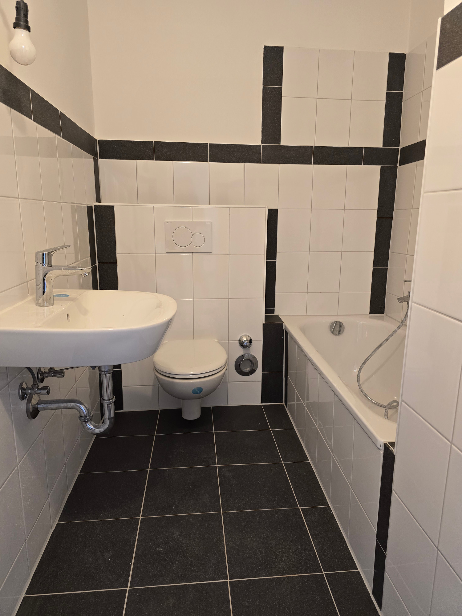 Das Badezimmer präsentiert sich nagelneu und geschmackvoll gestaltet – ausgestattet mit einer Badewanne, einem Hänge-WC und einem modernen Handtuchheizkörper. Hier trifft Funktionalität auf stilvolles Design.