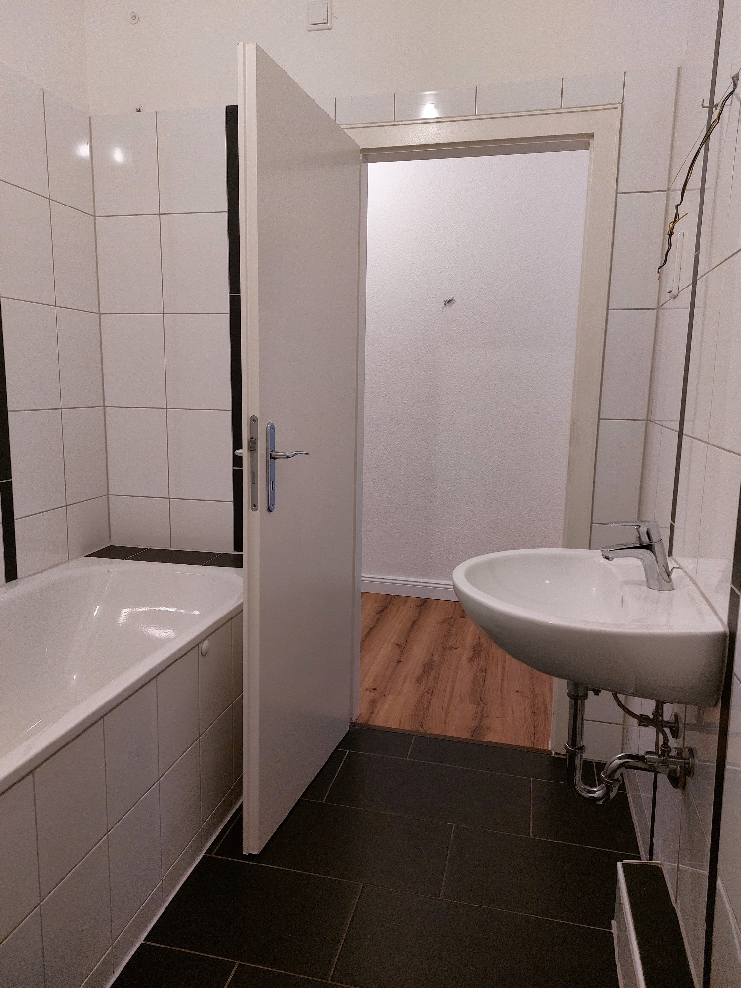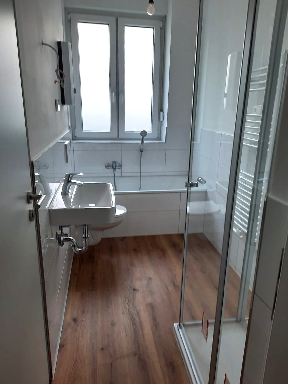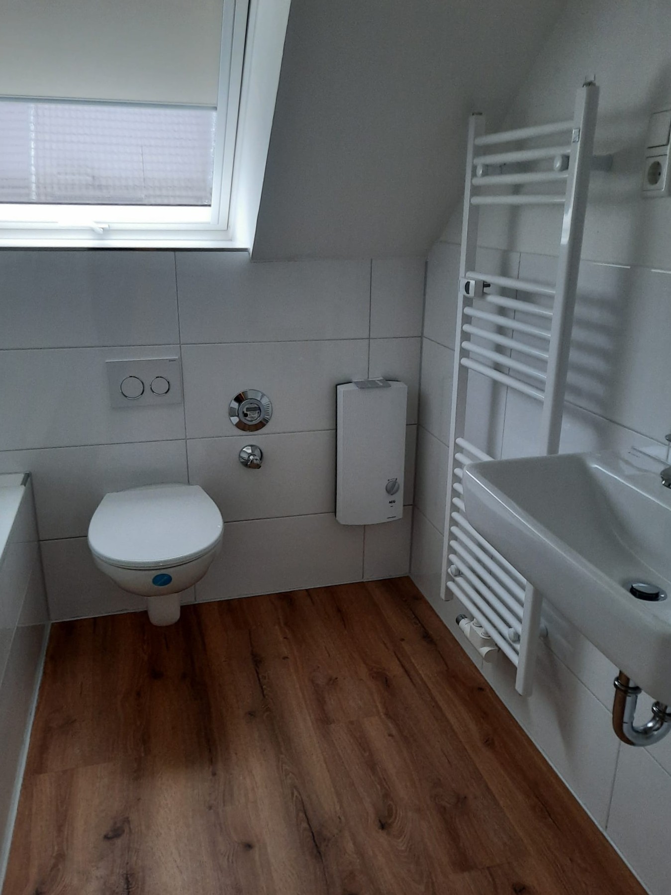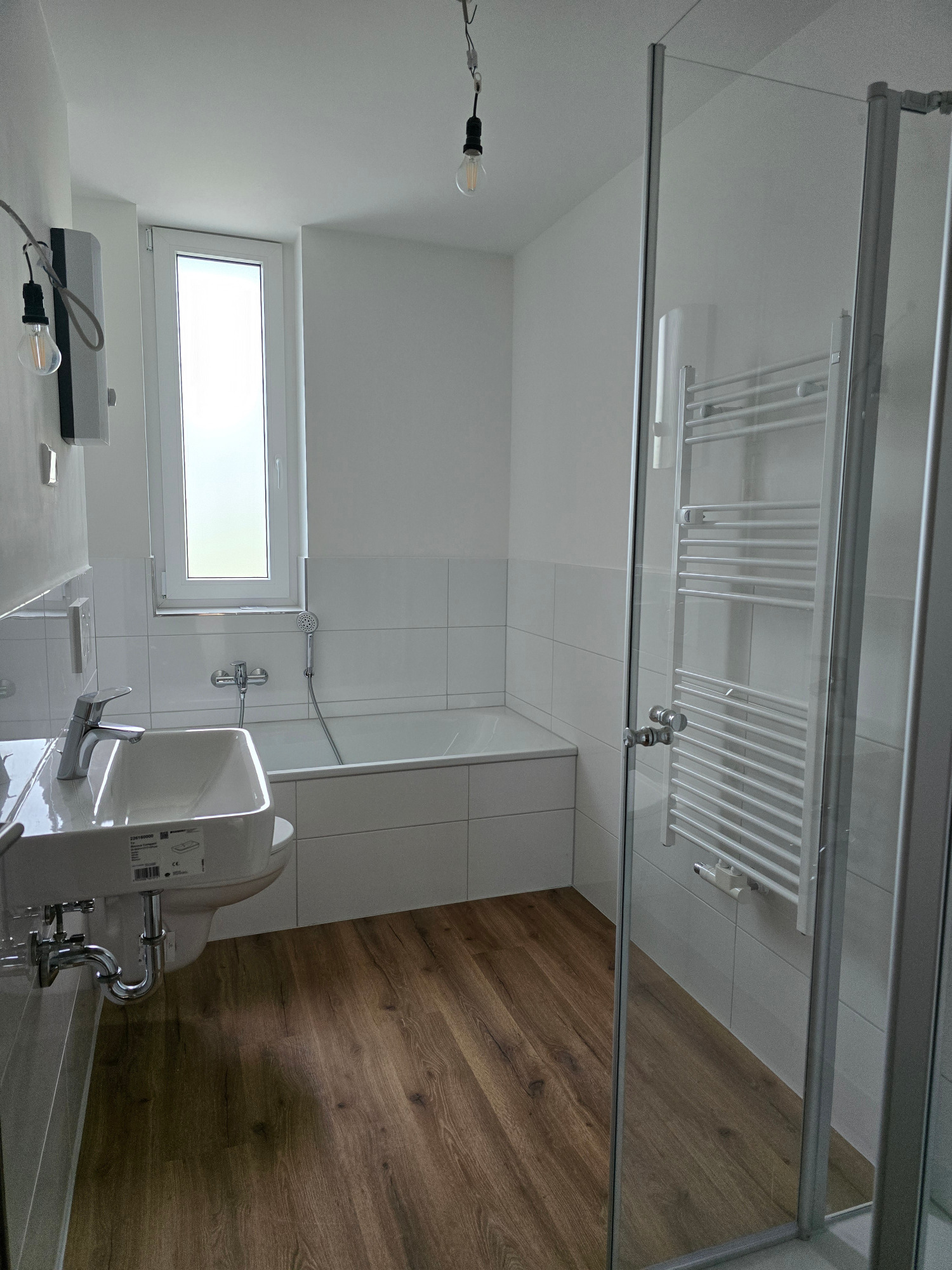 Das Badezimmer präsentiert sich nagelneu und geschmackvoll gestaltet – ausgestattet mit einer Badewanne, einem Hänge-WC und einem modernen Handtuchheizkörper. Hier trifft Funktionalität auf stilvolles Design.
