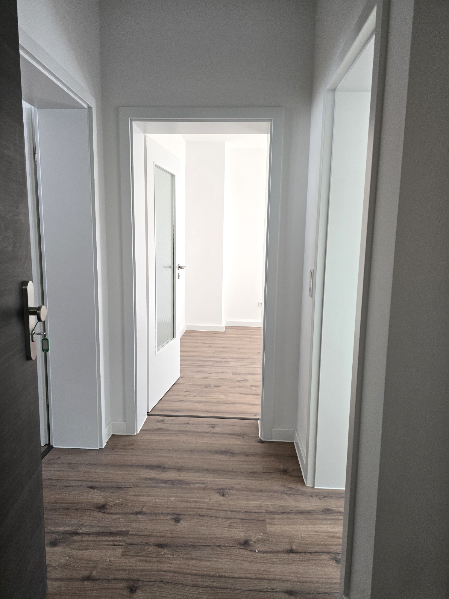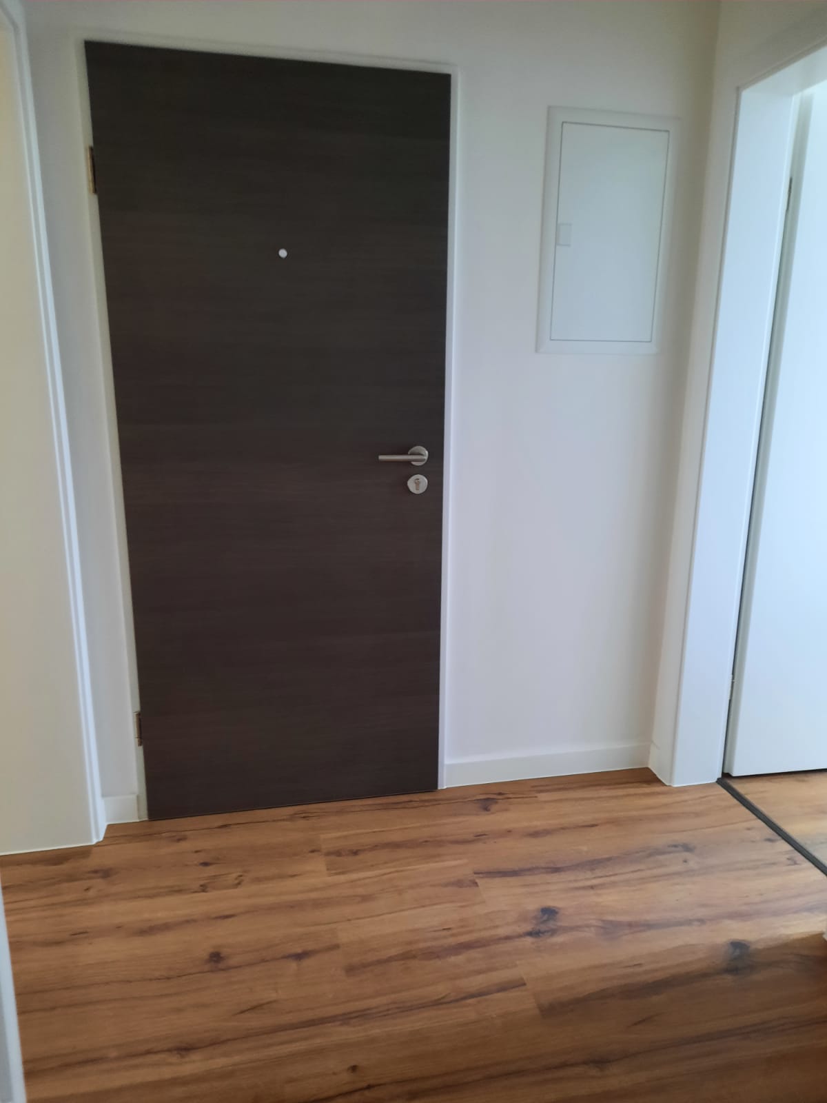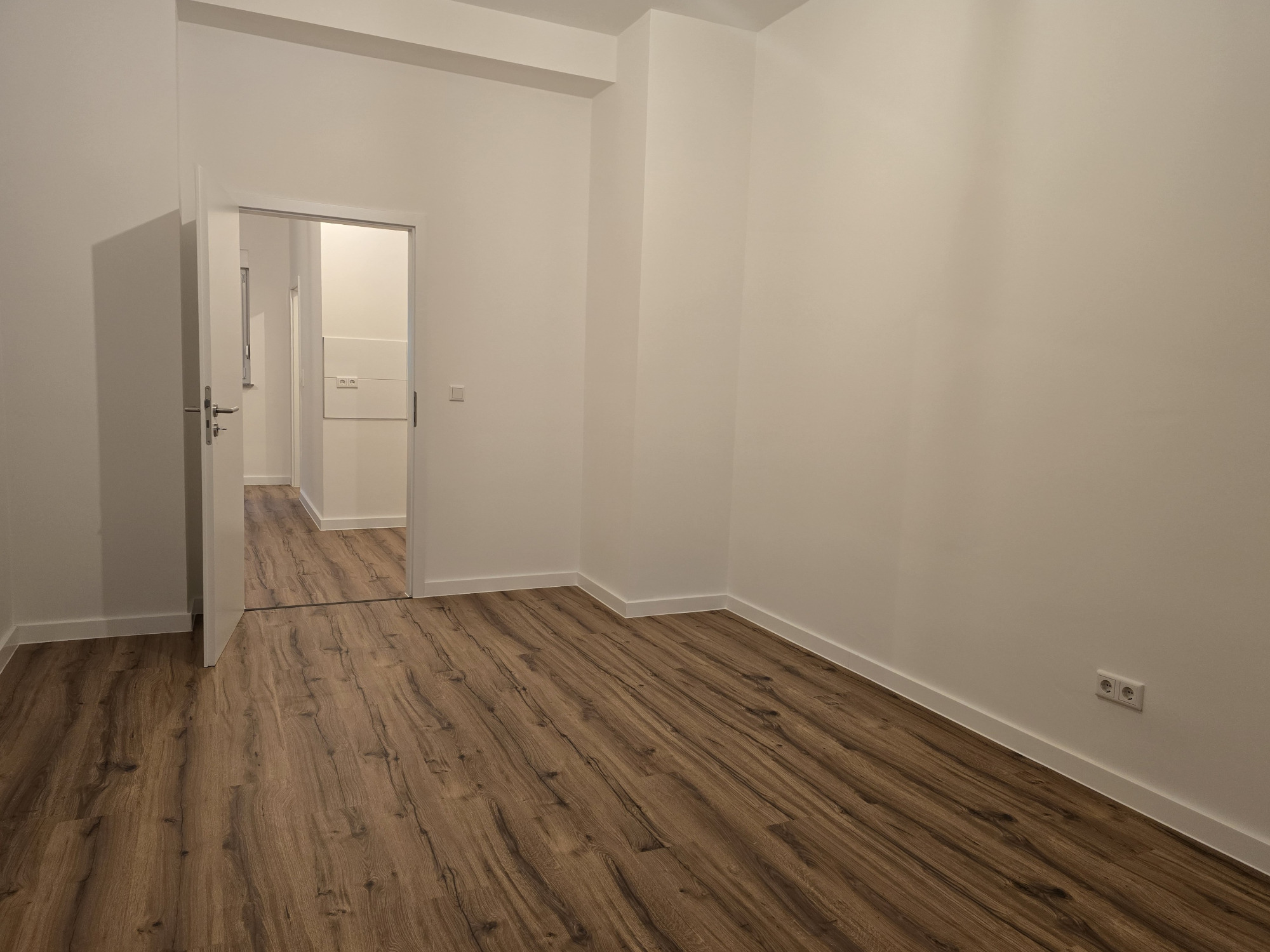 Der hochwertige Laminatboden zieht sich harmonisch durch die gesamte Wohnung und verleiht allen Räumen eine moderne, warme Atmosphäre.