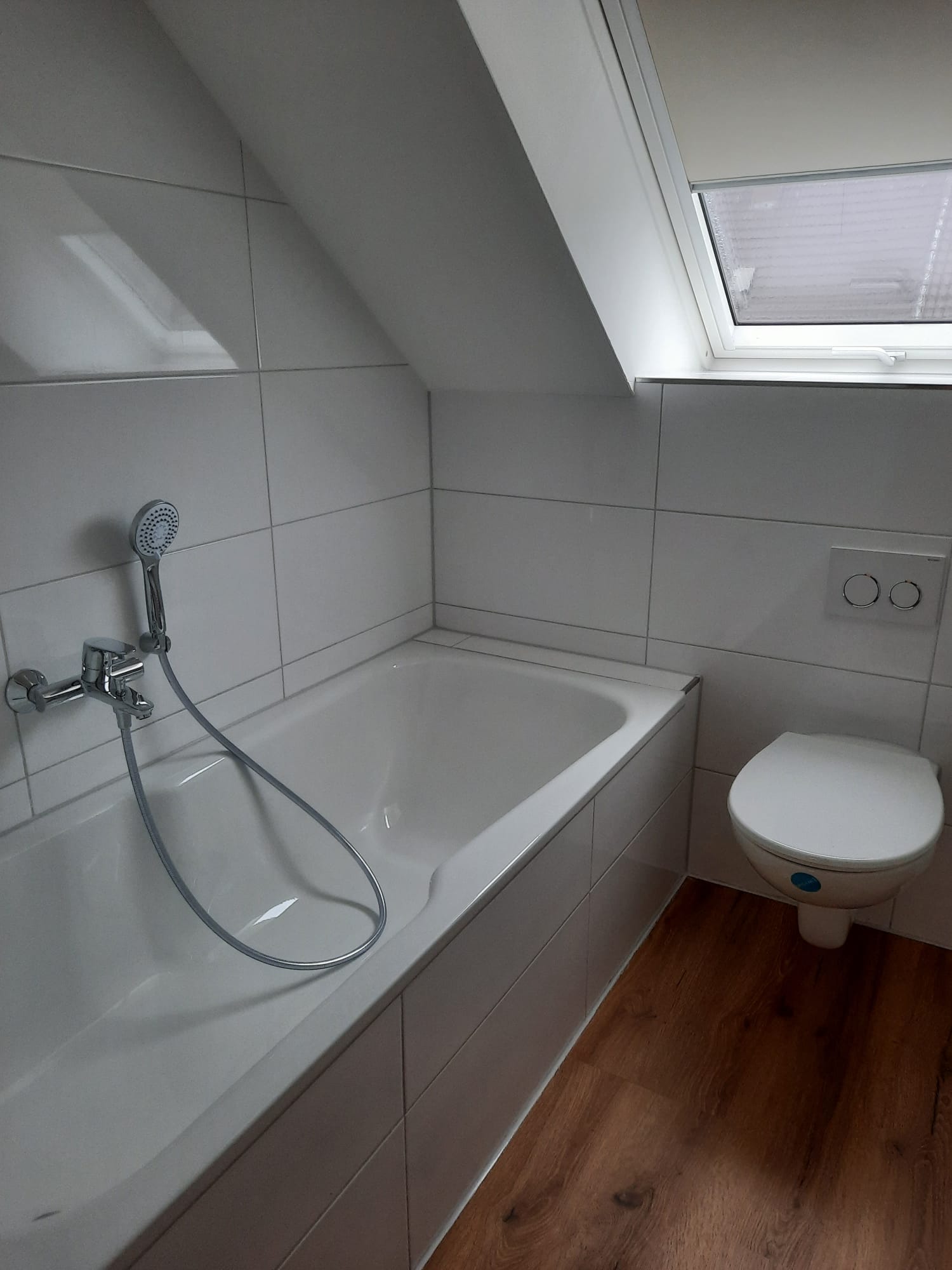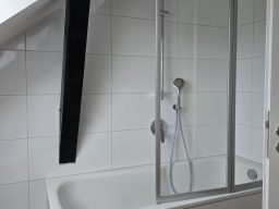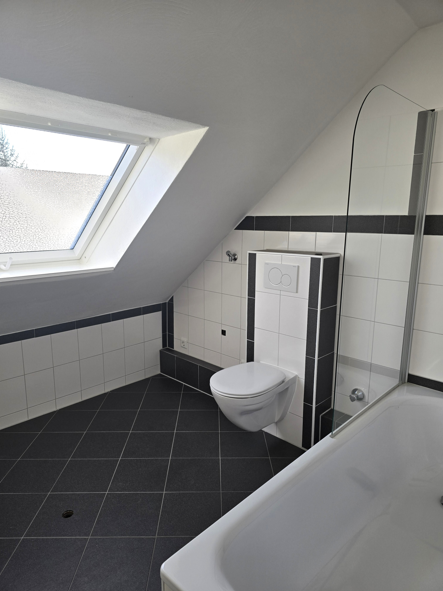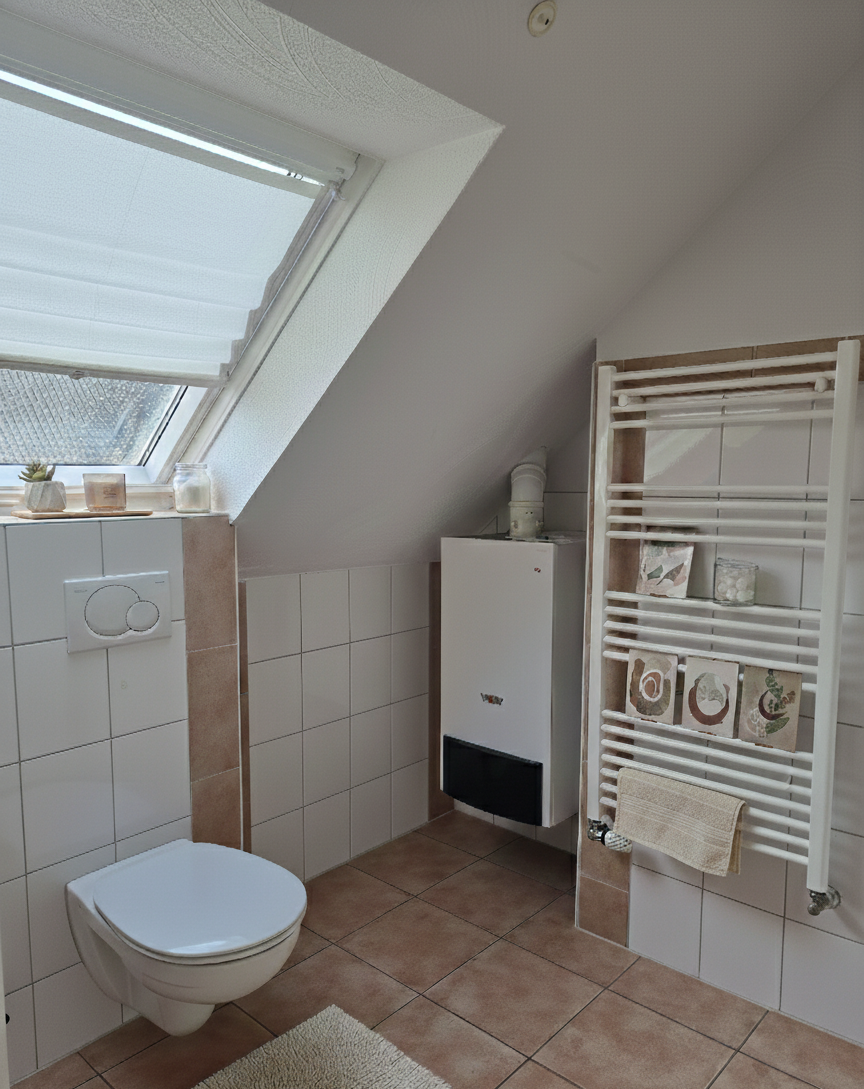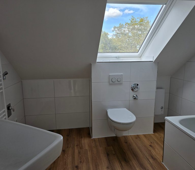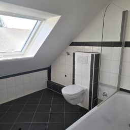 Ein echtes Highlight ist das nagelneue Badezimmer: Es ist modern gefliest und mit einer Badewanne, einer separaten Dusche, einem Hänge-WC und einem Handtuchheizkörper ausgestattet – ein Raum zum Wohlfühlen und Entspannen.