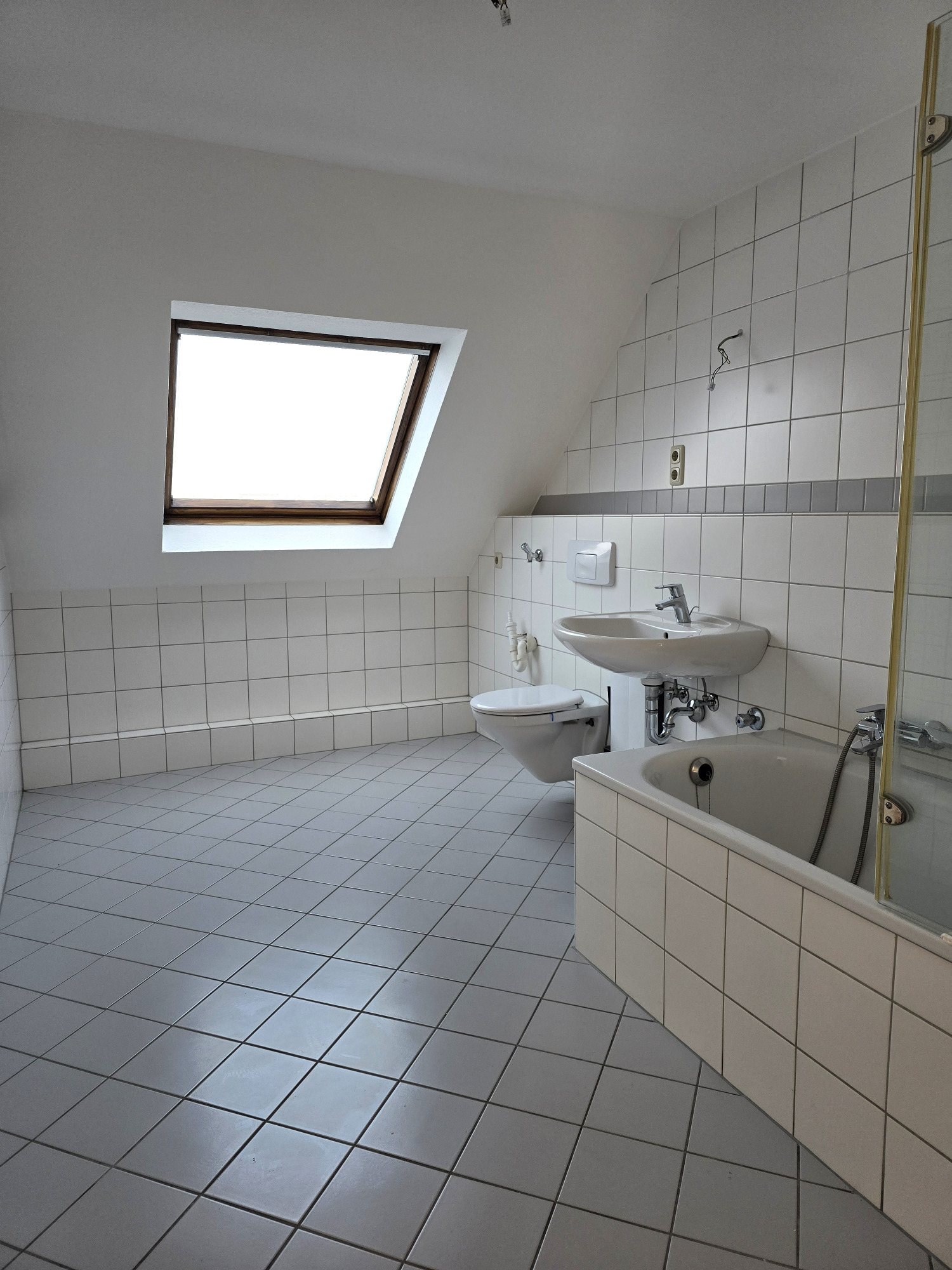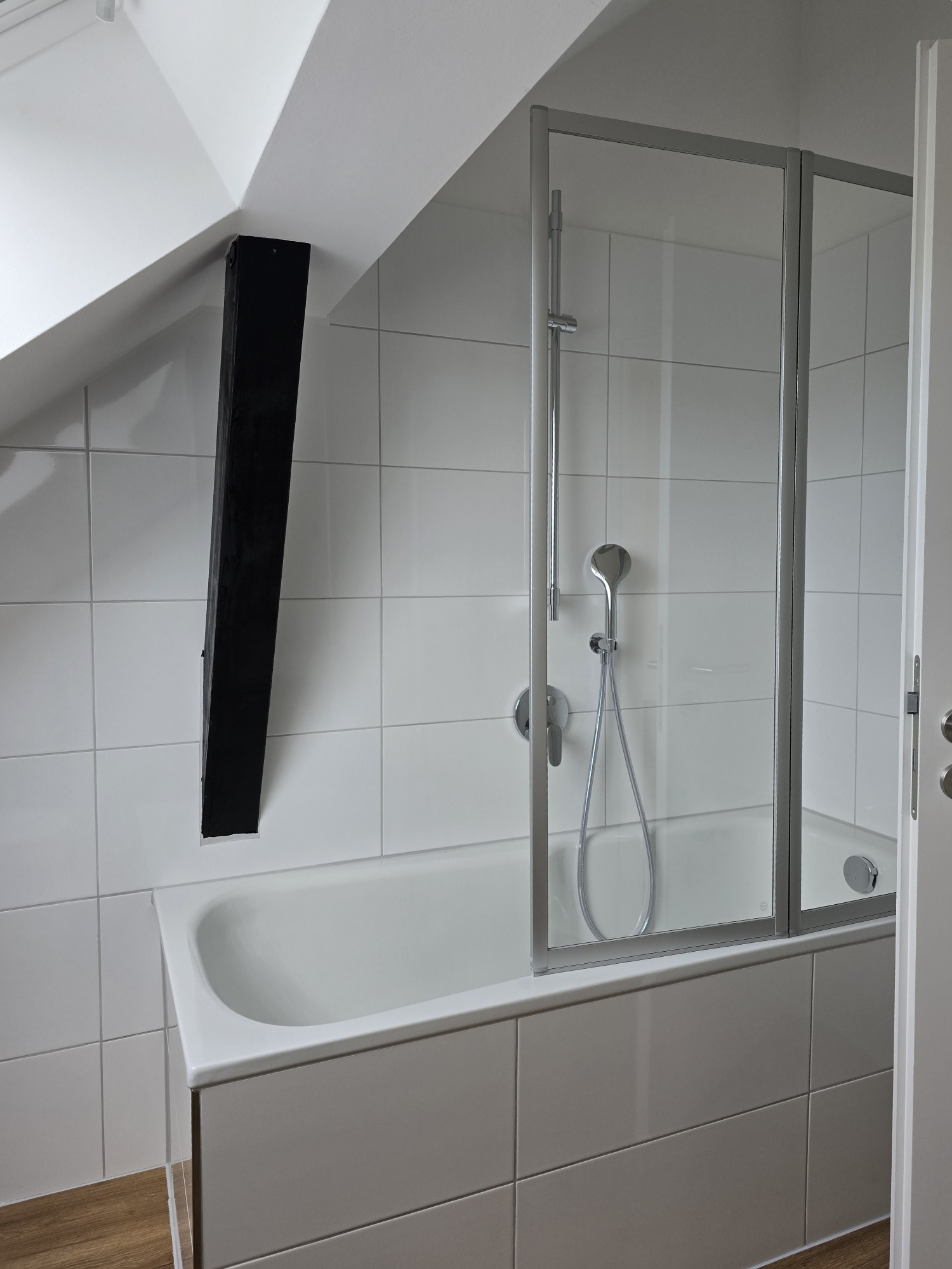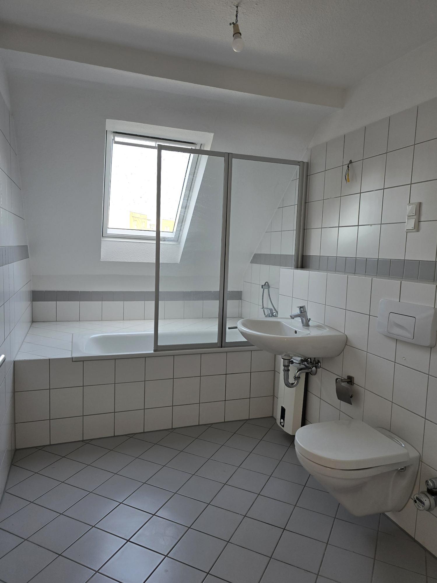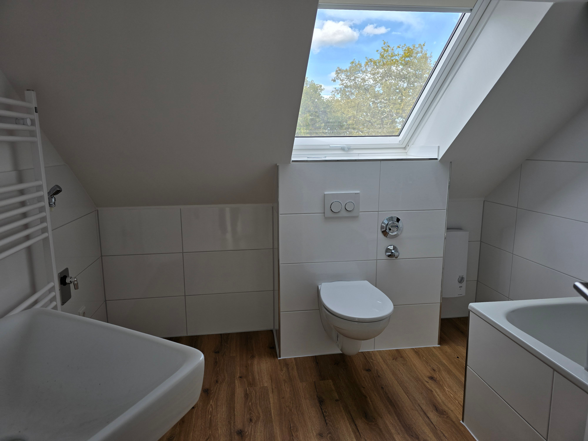 Ein echtes Highlight ist das nagelneue Badezimmer: Es ist modern gefliest und mit einer Badewanne, einer separaten Dusche, einem Hänge-WC und einem Handtuchheizkörper ausgestattet – ein Raum zum Wohlfühlen und Entspannen.