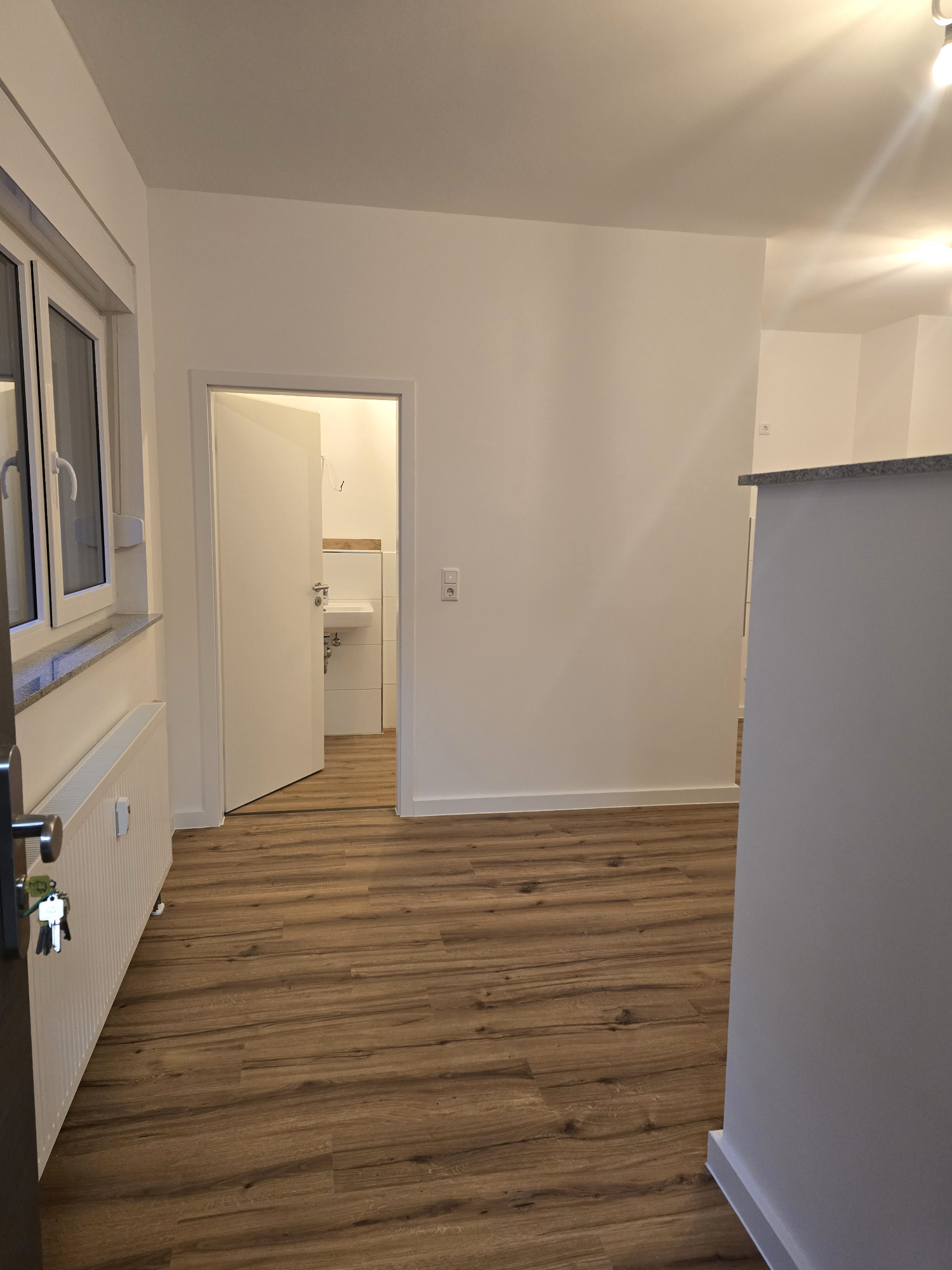 Der hochwertige Laminatboden zieht sich harmonisch durch alle Wohnräume und verleiht der Wohnung eine warme, einladende Atmosphäre.