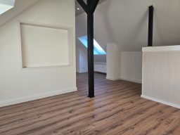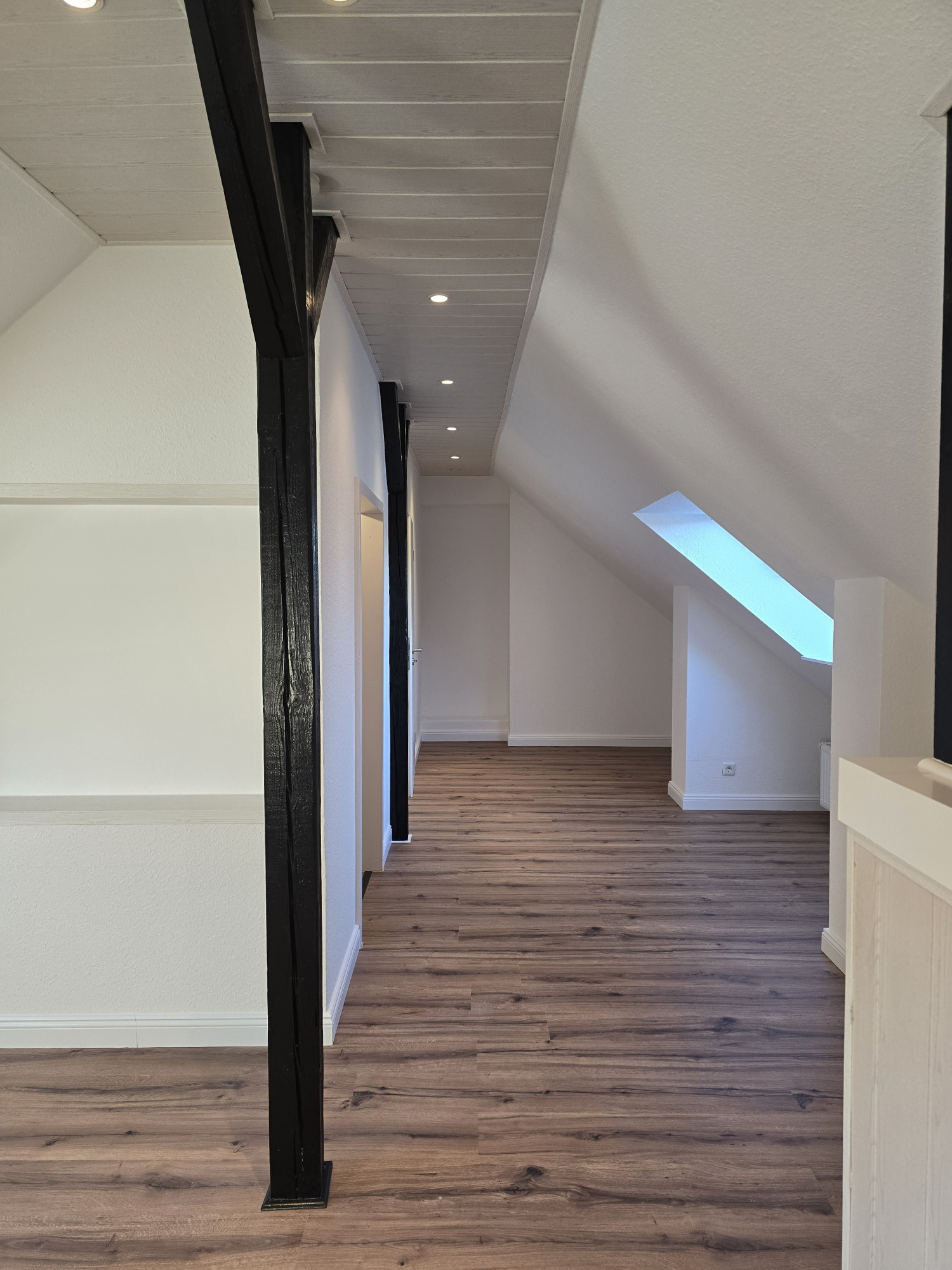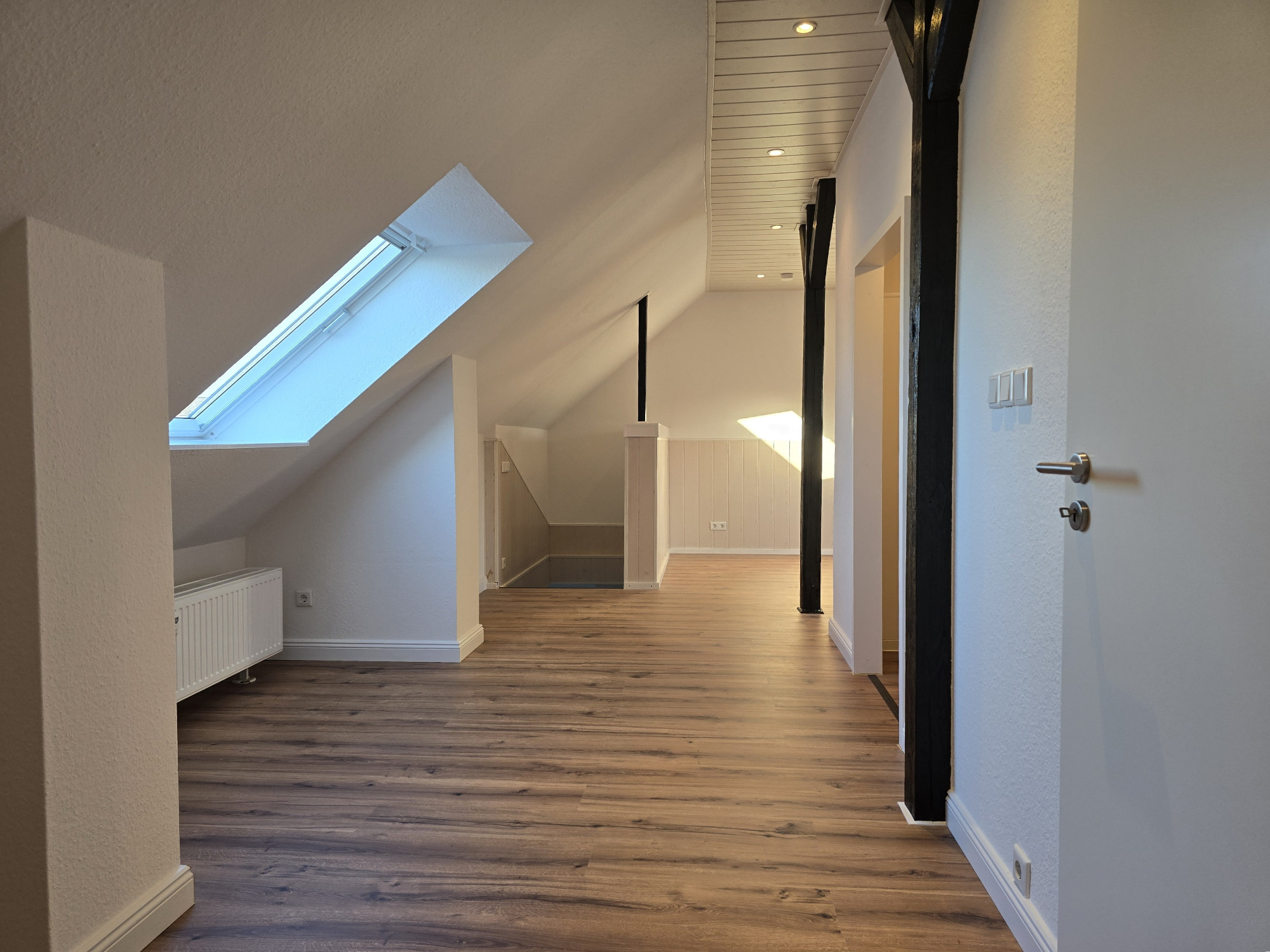 Über eine Treppe erreicht man den Wohn- und Schlafbereich, der durch gemütliche Holzbalken einen besonderen Charme erhält. Deckenintegrierte Spots sorgen für eine angenehme und moderne Beleuchtung. Von hier aus besteht zudem Zugang zu einem praktischen Ankleideraum, der zusätzlichen Stauraum bietet.