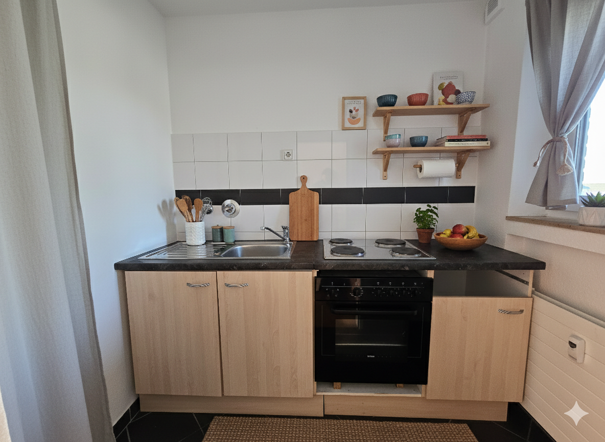 Die einladende Diele bietet Platz für eine stilvolle Garderobe oder individuelle Dekorationsideen und führt direkt zu einem praktischen Abstellraum – ideal für Haushaltsutensilien oder Vorräte. In der kompakten Küche lassen sich kleine und große Kochideen verwirklichen.