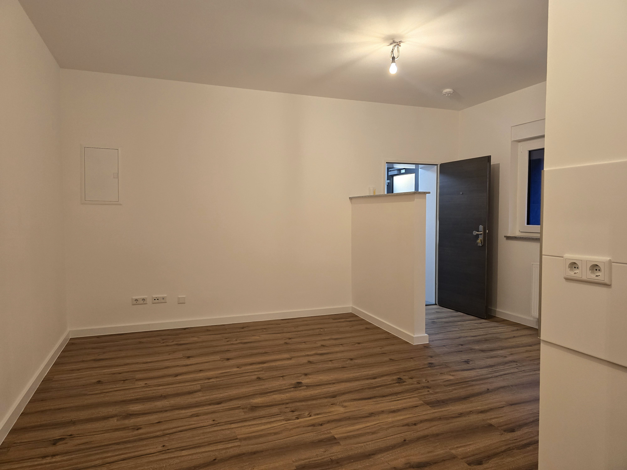 Beim Betreten der Wohnung gelangen Sie in den offenen Eingangsbereich, der harmonisch in den Wohnraum mit integriertem Kochbereich übergeht. Die offene Küche bietet ausreichend Platz für die Einrichtung eines gemütlichen Essbereichs und überzeugt durch ihre helle, einladende Atmosphäre.
