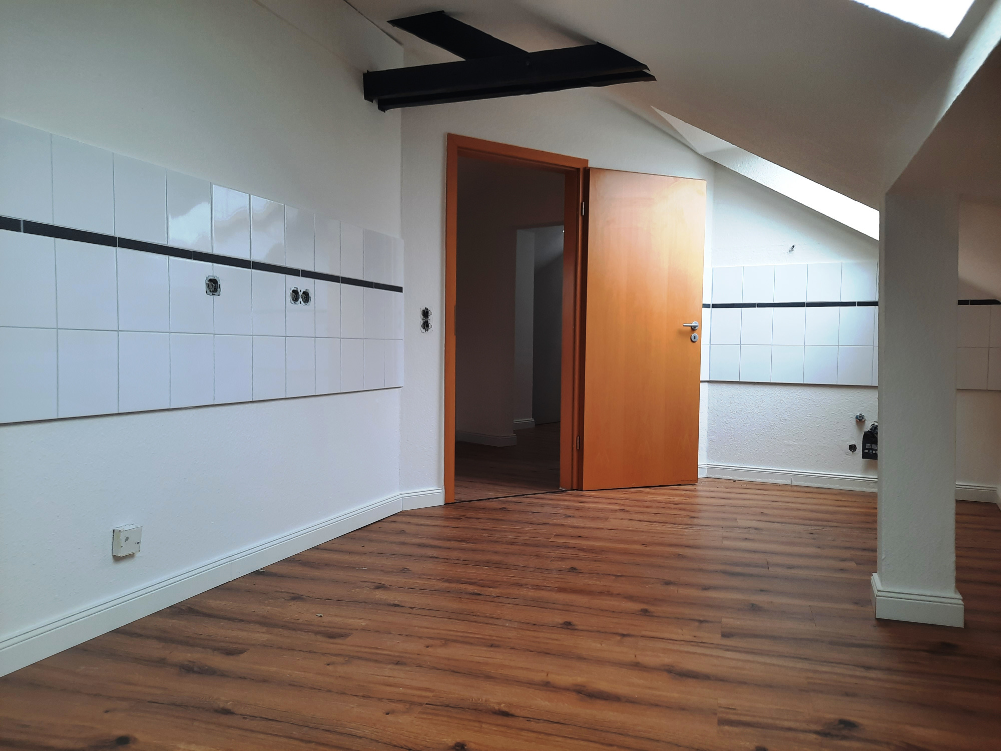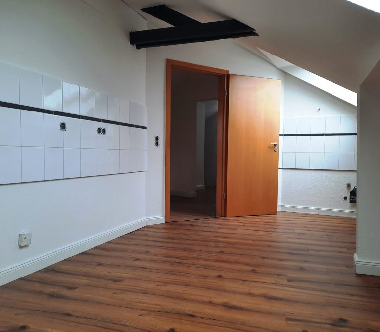 Diese ca. 50 m² große Wohnung erstreckt sich über zwei Etagen und präsentiert sich modernisiert sowie bezugsfertig. Bereits beim Betreten der Wohnung gelangt man in eine geräumige Küche, die ausreichend Platz zum Kochen und Verweilen bietet. Der gesamte Wohnraum ist mit hochwertigem Laminat ausgestattet und vermittelt ein modernes, gepflegtes Wohnambiente.