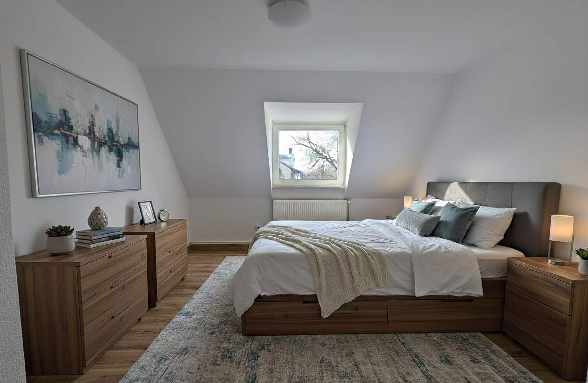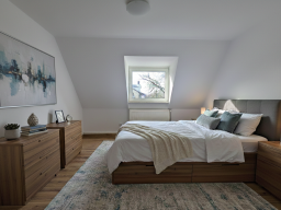 Das Schlafzimmer bietet ausreichend Platz für ein großes Bett und Kleiderschrank und schafft eine angenehme Rückzugsmöglichkeit.