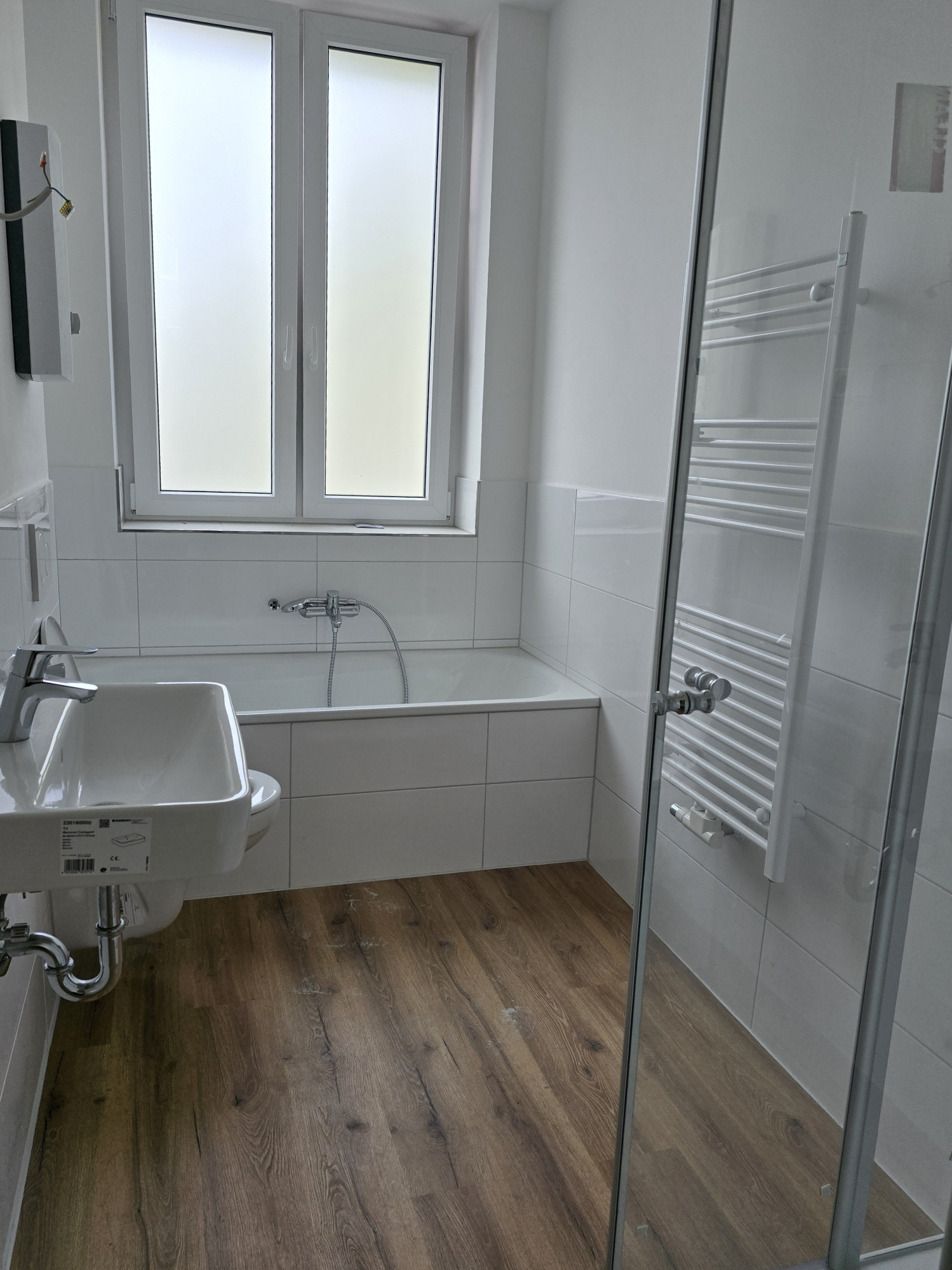 Das nagelneue Badezimmer ist ein echtes Highlight: Es wurde mit hochwertigen Sanitärelementen, einer Badewanne und separaten Dusche, einem modernen Hänge-WC sowie einem Handtuchheizkörper ausgestattet – ein Ort zum Wohlfühlen und Entspannen.