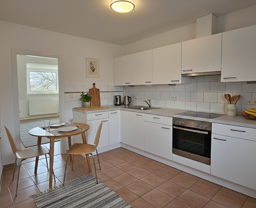 Die charmante, ebenfalls großzügig geschnittene Küche bietet viel Platz zum Kochen, Genießen und Beisammensein. Hier lassen sich sowohl praktische Arbeitsbereiche als auch ein gemütlicher Essplatz realisieren.
