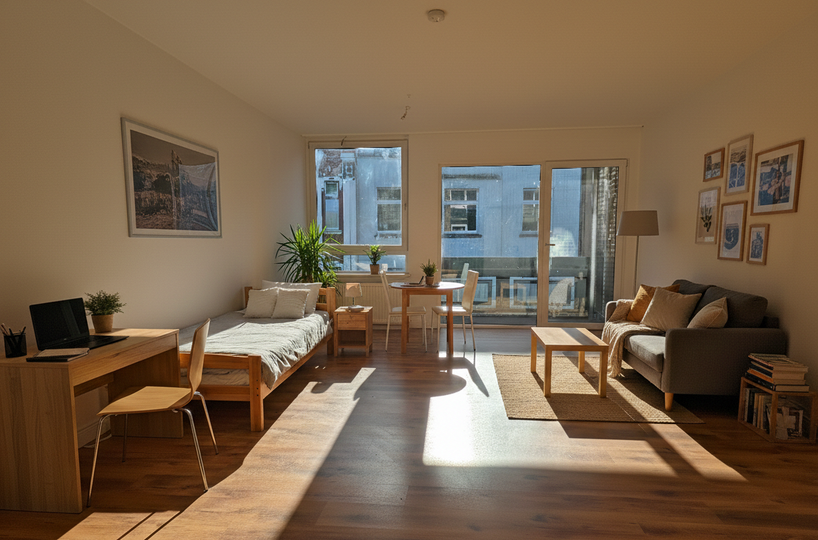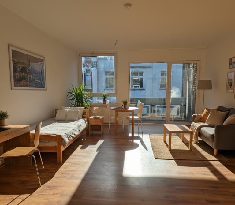 Der Wohn- und Schlafbereich ist mit einem hochwertigen Laminatboden ausgestattet, der den Räumen eine warme und moderne Note verleiht. Das Schlafzimmer bietet einen ruhigen Rückzugsort.